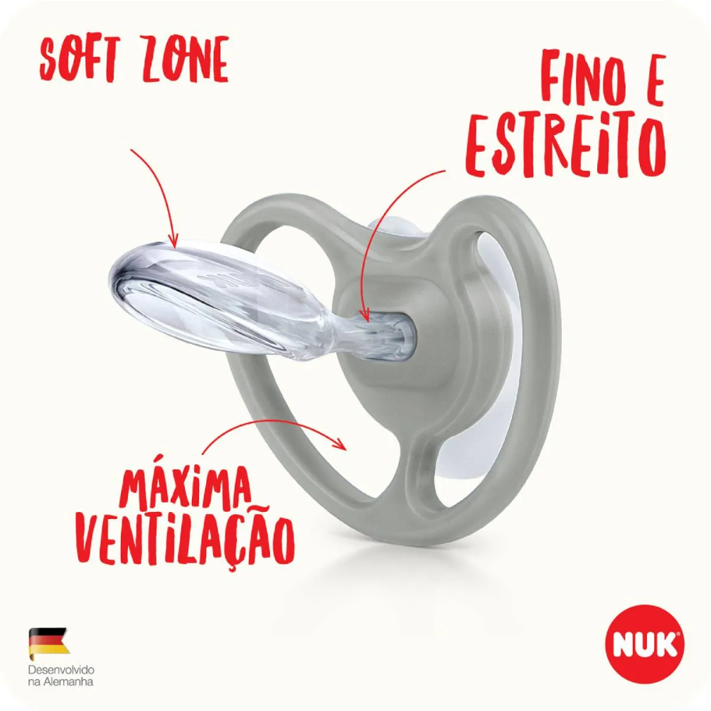 Chupeta Com bico em Silicone Space 0 a 6 meses NUK A Chupeta NUK Space foi desenvolvida com canais extragrandes de ventilação para permitir a máxima circulação de ar. O design do escudo em 3D é leve e arejado. Seu bico em silicone é 35% mais fino e 45% mais suave, além de ser mais estreito. Possui um estojo protetor que pode ser utilizado no micro-ondas para higienização da chupeta e também para o transporte. A NUK Space está disponível em 3 diferentes tamanhos, sendo: 0 a 6 meses, 6 a 18 meses e 18 a 36 meses. A chupeta é livre de BPA e o modelo apresentado é tamanho 0 a 6 meses. O MINISTÉRIO DA SAÚDE ADVERTE: A CRIANÇA QUE MAMA NO PEITO NÃO NECESSITA DE MAMADEIRA, BICO OU CHUPETA. O USO DE MAMADEIRA, BICO OU CHUPETA PREJUDICA O ALEITAMENTO MATERNO. Principais Características: - Bico Tamanho 1 (0 a 6 Meses) - Escudo Arejado - Bico 35% mais fino e 45% mais suave - Embalagem para higienização e transporte - Livre de BPA Especificações Técnicas: - Conteúdo da Embalagem: 01 Chupeta e 01 Guarda Chupeta - Composição/Material: Polipropileno e Silicone - Certificação Inmetro: CE-PUR/IQB 000612 NBR 10334 OCP 0006 - Referência do Fabricante: PA7349-1G - EAN: 7896098813355 - Marca: NUK Imagens meramente ilustrativas, as cores e estampas podem variar de acordo com o lote do fabricante.
