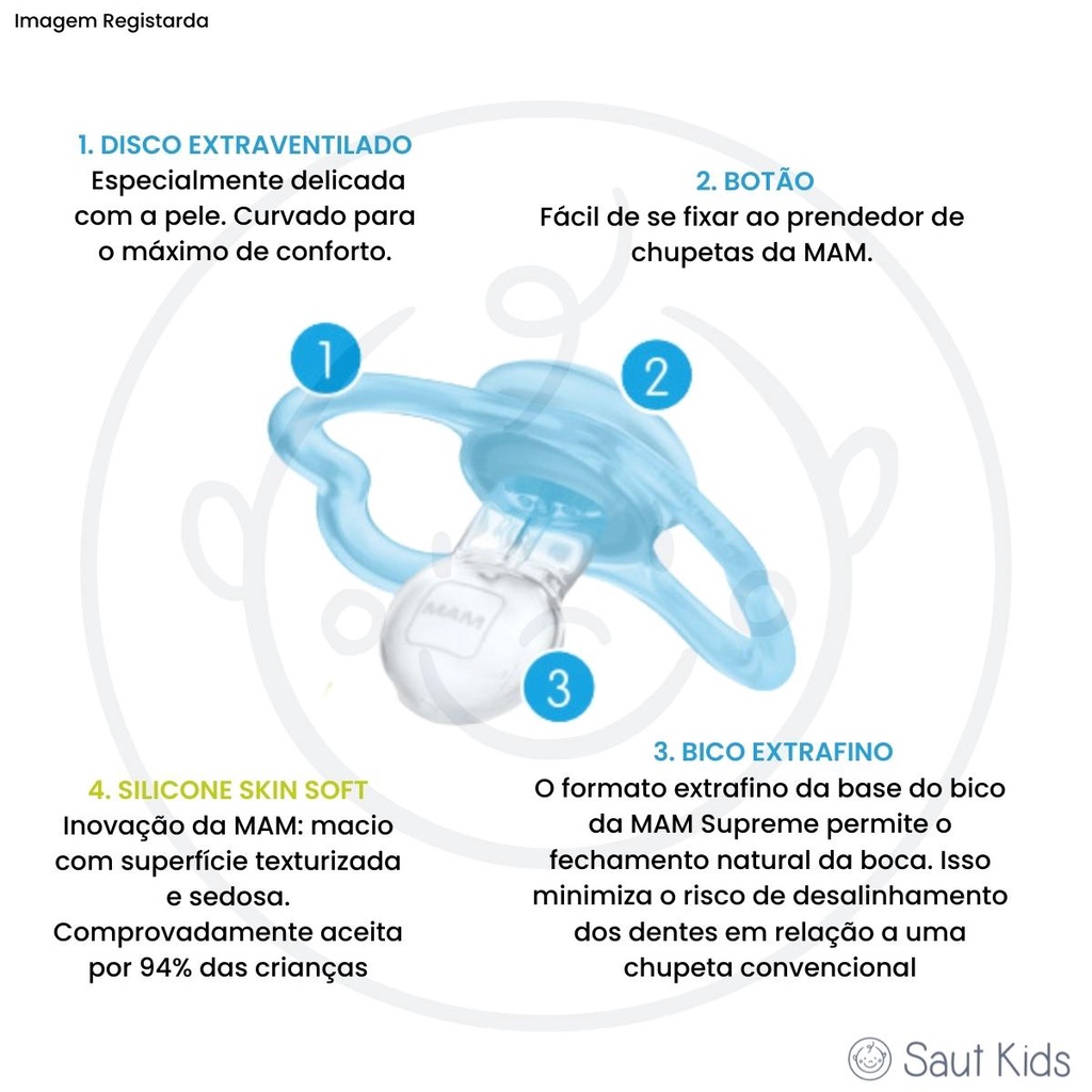 Chupeta MAM 6+M Supreme Embalagem Dupla Neutra Agora você pode ver o sorriso do seu bebê, mesmo com a chupeta! Com design diferenciado, a chupeta da MAM proporciona momentos incríveis entre mamãe e bebê, e com as brincadeiras não seria diferente. A inovadora chupeta Supreme MAM foi especialmente projetada para reduzir o risco de desalinhamento dos dentes. Isso porque seu bico extrafino em Silicone SkinSoft, macio com superfície texturizada e sedosa, comprovadamente aceita por 94% das crianças é 60% mais fino e 4 vezes mais flexível que outras chupetas convencionais, permitindo o fechamento natural da boca. Perfeita para mostrar o sorriso mais bonito, a chupeta Supreme MAM também é superleve e confortável devido ao seu exclusivo disco extra ventilado delicado com a pele, especialmente desenhado para permitir a circulação do ar. A Supreme MAM vem em um estojo esterilizável, que esteriliza a chupeta no microondas em 3 minutos e permitindo seu armazenamento e transporte. CE-PUR/IQB 000265 NBR 10334 - OCP 006 DISCO Extraventilada - Especialmente delicada com a pele Curvado para o máximo de conforto. BOTÃO Fácil de se fixar ao prendedor de chupetas da MAM. BICO EXTRAFINO O formato extrafino da base do bico da MAM Supreme permite o fechamento natural da boca. Isso minimiza o risco de desalinhamento dos dentes em relação a uma chupeta convencional. SILICONE SKIN SOFT Inovação da MAM: macio com superfície texturizada e sedosa. Comprovadamente aceita por 94% das crianças. ESTERILIZÁVEL Acompanha estojo para transporte e esterilização em até 3 minutos no microondas. Ao esterilizar utilizando o nosso estojo há 77% de economia de energia e redução da emissão de CO2. Fabricado na Europa. Conteúdo e composição: 1 chupeta com disco em polipropileno e bico em silicone. Clinicamente provada: um estudo longitudinal confirma que o bico da MAM Supreme minimiza o risco de desalinhamento dos dentes em relação a uma chupeta convencional. (Estudo clínico: Y. Wagner, R. Heinrich-Weltzien, “Effect of a thin-neck, pacifier on primary dentition: a randomized controlled trial”, Orthodontics & Craniofacial Research, Volume 19, Ed. 3, págs. 127-136, 94% de aceitação, pesquisa de mercado 2010-2019, testada com 1.463 crianças. Relatórios científicos do instituto Wild-Hi-Precision comprovaram: a base do bico da MAM Supreme, é em média 60% mais fina; série de testes de University Clinic of Dentistry de Viena confirmaram: também é em média 4 vezes mais flexível que outras chupetas comparáveis. (Entre: 32-83% mais fina / 1,1 - 19,5 vezes mais flexível que chupetas regulares de silicone).