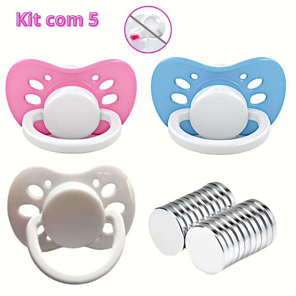Chupeta Sem Bico para Bebê Reborn Pacote 5 Pçs + IMA - Chupeta Boneca p/ montar Chupeta Magnética