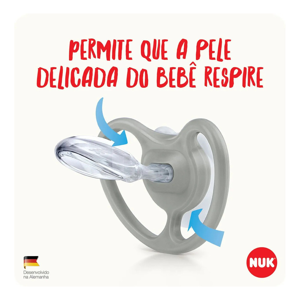 A Chupeta NUK Space é particularmente gentil com a pele delicada do bebê, porque foi especialmente desenvolvida com canais extragrandes de ventilação para permitir a máxima circulação de ar, possibilitando que a pele sensível respire. O design do escudo em 3 D é moderno, leve e arejado. NUK Oral Fit 2.0 ou seja, 35% mais fino e 45% mais suave, além de ser mais macio e estreito. Se encaixa perfeitamente na boca proporcionando maior conforto em cada fase do crescimento do bebê. Possui um estojo protetor que pode ser utilizado no micro ondas para higienização da chupeta e também para o transporte. Especificações Técnicas: - Conteúdo da Embalagem: 1 Chupeta Space - Composição/Material: Polipropileno e Silicone - Desenho: Raposa - SKU: PA7349-1G - Código EAN: 7896098813355 - Marca: NUK Imagens meramente ilustrativas, as cores e estampas podem variar de acordo com o lote do fabricante*
