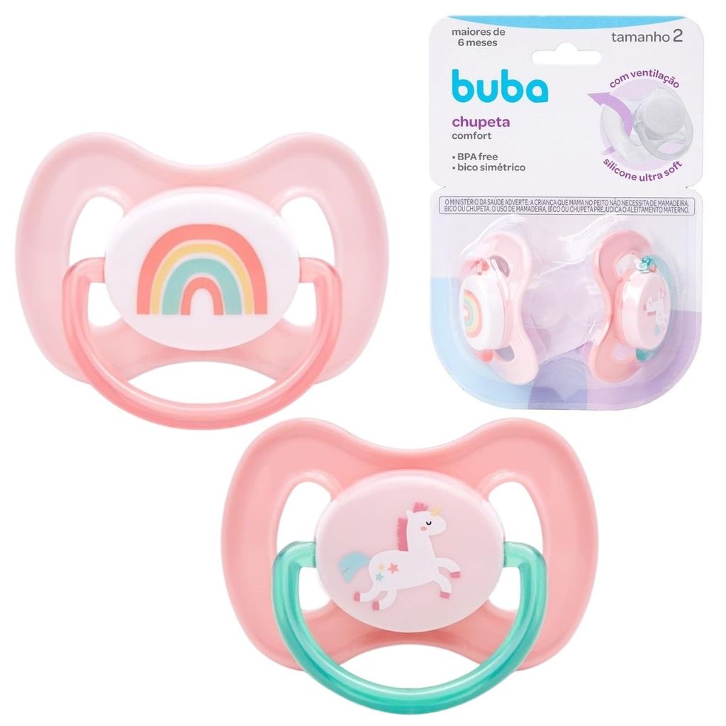 DESCRIÇÃO DO PRODUTO A Chupeta Buba Comfort tamanho 2 foi desenvolvida para crianças a partir de 6 meses. Com design anatômico e bico simétrico em silicone ultra macio, proporciona uma experiência segura e agradável. Seu bico simétrico é produzido em 100% silicone ultra soft, proporcionando maior conforto e facilitando a aceitação pelo bebê. A forma simétrica permite que a chupeta seja posicionada de qualquer lado na boca, o que ajuda na adaptação natural durante o uso. Design preserva o fluxo de ar, ideal para a pele delicada do bebê. CARACTERÍSTICAS TÉCNICAS: Conteúdo da Embalagem: 2 Chupetas Magic Unicórnio Tamanho 2 Dimensões Aproximadas do Produto: 4 cm x 5,5 cm x 4 cm (Altura x Largura x Comprimento/Profundidade). Dimensões Aproximadas da Embalagem: 14 cm x 10 cm x 5 cm (Altura x Largura x Comprimento/Profundidade). Material/Composição: Base e alça: 100% Polipropileno (PP), Bico: 100% Silicone Idade Mínima Recomendada: 0 - 6 meses Marca: Buba Referência: 21120 Outras informações: As cores podem variar entre as imagens mostradas acima e o produto. Imagens meramente ilustrativas. Aviso: As informações e imagens divulgadas são de total responsabilidade do fabricante/fornecedor. Produto lacrado e disponível a pronta entrega para todo Brasil! APROVADO PELO INMETRO