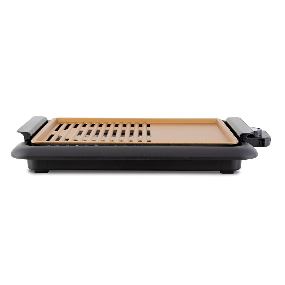 A Churrasqueira Elétrica Philco PCQ1500D tem poderoso antiaderente Maxx Gold, ele é durável, resistente e fácil de limpar, grelha os alimentos sem grudar. É ideal para ser utilizada dentro de casa, a gordura dos alimentos vai direto para a bandeja coletora, impedindo que entre em com contato com a superfície aquecida, evitando a fumaça. Saia do convencional, faça uma refeição diferente e mais saborosa com a PCQ1500D. Surpreenda a todos! Características: Grelha de alumínio com revestimento antiaderente dourado Revestimento antiaderente base água Alças laterais com toque a frio (Baquelite) 40 chapa Lisa e 60 Grelha Acompanha Bandeja de água/ Coletor de gordura Grelha removível Baixa emissão de fumaça Seletor de temperatura Termostato removível Pés antiderrapantes Base/Suporte de plástico Sistema de segurança: Só liga se estiver montado na base Formato da chapa60 grelha e 40 chapa lisa Potência (W): 1500W Dimensões: Altura: 7,7 cm Largura: 50 cm Profundidade: 34,5 cm Peso: 2,05 Kg Garantia do fornecedor de 12 meses.