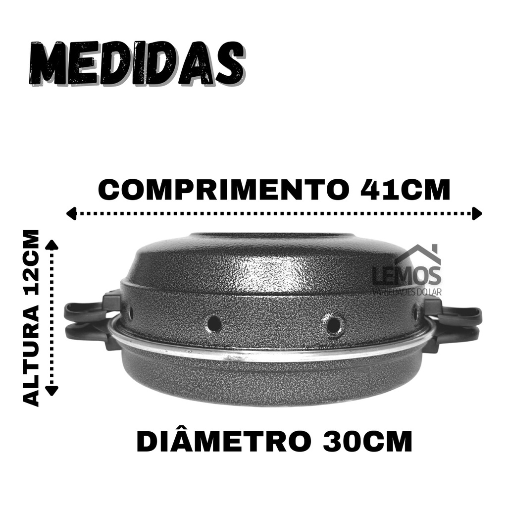 Churrasqueira Para Fogão Faz Grelhados Churrasco Assar Pães Carnes Peixes Frango Com a Churrasqueira o seu dia se torna mais prático e delicioso, para fazer grelhados de carne, peixe, frango, legumes e assar pães. Isso representa saúde, qual seja, menos gordura e mais sabor. Poderá utilizar água embaixo da grelha ao fazer os grelhados, para coletar a gordura, facilitando na Limpeza. Enviamos no mesmo dia útil, comprando até as 13:00 Especificação Técnica: Comprimento: 41cm Tampa: 31cm diâmetro Grelha: 29,5cm diâmetro e furo central 8,5cm diâmetro Caçarola: 30cm diâmetro x 12cm de altura Material: Alumínio Cores Disponíveis: Preta, Vermelha ou Polida Itens Inclusos 01 Caçarola de alumínio com alças de baquelite 01 Grelha de alumínio 01 Tampa de alumínio