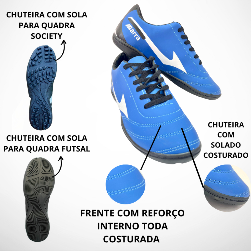 🥅 Chuteira Esportiva Marra - SOCIETY ou FUTSAL | Adulto ⚽ Eleve seu jogo com a chuteira Marra, disponível nas cores vermelha e azul royal! Desenvolvida para proporcionar conforto, desempenho e estilo, essa chuteira é ideal tanto para partidas no campo society ou nas quadras de futsal. Características do Produto: ✅ Disponível nas versões: ➤ Society (solado com travas para quadra de grama sintética) ➤ Futsal (solado liso, ideal para quadra salão) ✅ Cores disponíveis: 🔴 Vermelha com detalhes em branco 🔵 Azul royal com detalhes em branco ✅ Fechamento em cadarço para melhor ajuste ✅ Parte interna com reforço toda costurada bem reforçada ✅ Solado colado e costurado ✅ Design moderno e leve ✅ Excelente aderência e durabilidade ✅ Ideal para jogadores amadores e profissionais 📏Tabela com medidas internas do produto: Nº 45 ------ 30,0 cm Nº 44 ------ 29,5 cm Nº 43 ------ 28,4 cm Nº 42 ------ 27,8 cm Nº 41 ------ 27,2 cm Nº 40 ------ 26,6 cm Nº 39 ------ 26,0 cm Nº 38 ------ 25,4 cm Nº 37 ------ 24,8 cm Nº 36 ------ 24,2 cm Nº 35 ------ 23,6 cm Nº 34 ------ 23,0 cm O que acompanha: ✅Caixa ✅Um par de cadarços Garantia: Contra defeito de fabricação. Conservação e Limpeza: Limpe com pano umedecido, água e sabão neutro deixe secar à sombra, para retirar odores deixe em local seco e arejado por 12 horas. 📦 Envio rápido e seguro! Todas as chuteiras são enviadas com muito cuidado para garantir que cheguem até você em perfeito estado. TEMPO ESTIMADO DE ENTREGA: Para as regiões Sul e Sudeste de 7 a 9 dias úteis Minas Gerais - média de 5 dias úteis Demais regiões de 10 a 12 dias úteis 💬 Dúvidas? Envie uma mensagem e nossa equipe terá o prazer de ajudar! • Fotos reais do próprio produto. Agradecemos pela visita em nossa loja!!
