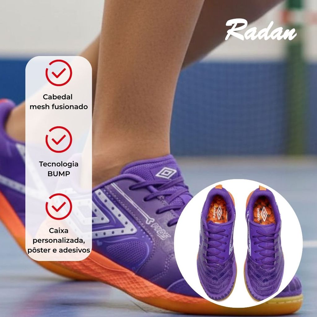 Eleve sua performance nas quadras com a Chuteira Masculina Umbro Pro 5 Bump Futsal Roxo/Laranja, um modelo que traz tecnologia, estilo e personalidade inspirada no Día de Los Muertos. A combinação de grafismos especiais e cores vibrantes garante presença marcante dentro de qualquer jogo. Seu cabedal mistura couro natural, sintético laminado e mesh fusionado, oferecendo durabilidade, respirabilidade e ajuste preciso. O reforço em camurça na biqueira garante resistência extra, ideal para quem exige estabilidade nas jogadas mais intensas. A tecnologia BUMP aplicada na palmilha e entressola entrega amortecimento eficiente e retorno de energia, deixando cada passo mais leve e responsivo. A sola de borracha com EVA proporciona aderência e segurança, essenciais para a prática do futsal. A Umbro Pro 5 Bump é a chuteira ideal para quem busca firmeza, conforto e visual exclusivo. Um modelo de alta performance desenvolvido para elevar o jogo e destacar o atleta em quadra. As Lojas Radan contam com 10 lojas físicas no Rio Grande do Sul, oferecendo esta e uma grande variedade de produtos e marcas de calçados e vestuário feminino, masculino, infantil e esportivo. Compre online com entrega rápida para todo o Brasil ou em uma de nossas lojas físicas, aproveitando nossa experiência e adquirindo produtos de qualidade. Aproveite! Produto de autenticidade garantida vendido pelas Lojas Radan. A cor do produto nas fotos pode sofrer alteração em decorrência do uso do flash ou da configuração do seu monitor. Características: Nome do produto: Chuteira Masculina Umbro Pro 5 Bump Futsal Roxo/Laranja Modelo: U03FB00386 Indicado: Esportivo Composição geral: Couro, sintético e poliéster Material interno: Têxtil Palmilha: EVA Solado: Borracha e EVA Tipo de chuteira: Futsal Fechamento: Cadarço Tecnologias: BUMP (amortecimento e retorno de energia) Mesh fusionado (respirabilidade) Reforço em camurça na biqueira Diferencial: Edição especial inspirada no Día de Los Muertos. Acompanha caixa personalizada, pôster e adesivos. Dimensões aproximadas: Tamanho: 37: 24 cm Tamanho: 38: 25 cm Tamanho: 39: 25.5 cm Tamanho: 40: 26.5 cm Tamanho: 41: 27.5 cm Tamanho: 42: 28 cm Tamanho: 43: 29 cm Tamanho: 44: 30 cm Peso do produto: 925g Produto Original: Autenticidade garantida pelas Lojas Radan