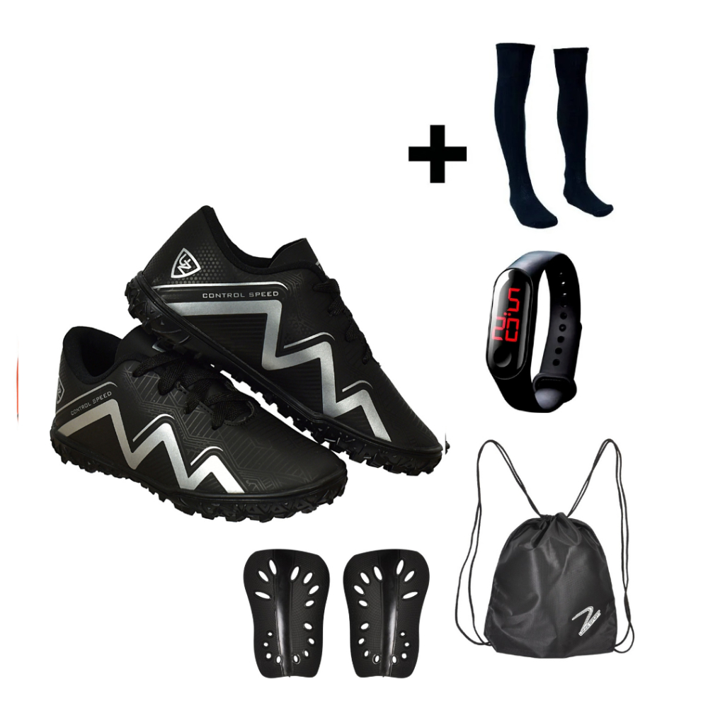 Chuteira Society Sintética 1000 Infantil + Meião + Relógio + Caneleira + Mochila