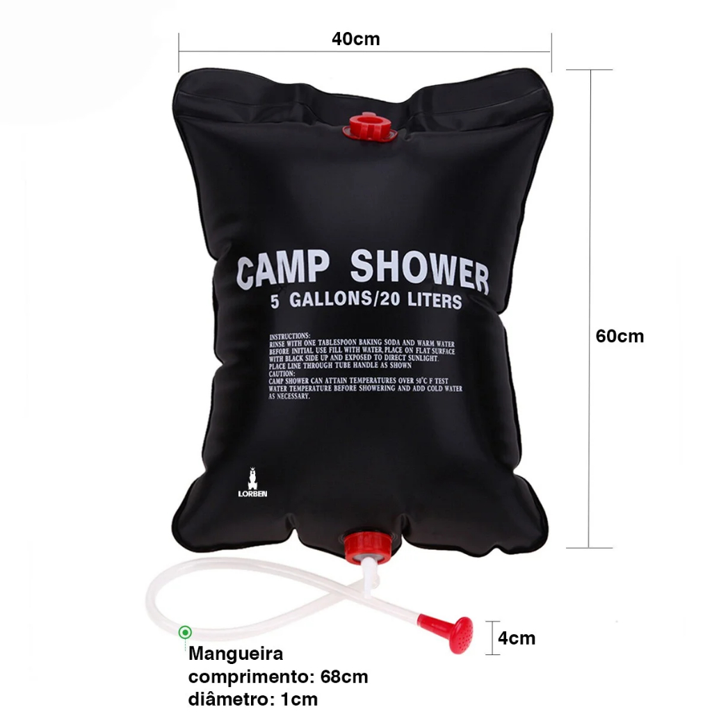 Cansado de banhos improvisados e gelados em suas aventuras? O Chuveiro Portátil Lorben é a solução definitiva para quem não abre mão da higiene e do conforto, seja no camping, na praia, em pescarias ou após trilhas intensas. Com tecnologia de absorção solar, você garante água aquecida de forma sustentável e sem gastar energia! [Destaques do Produto] Aquecimento Ecológico: O revestimento especial transforma a luz solar em calor, atingindo até 50°C. Capacidade Generosa: 20 litros garantem um banho completo e relaxante. Design Inteligente: Visor transparente no verso para controle total do nível de água. Material Premium: Fabricado em PVC atóxico reforçado para máxima durabilidade. [Especificações Técnicas] Marca: Lorben Capacidade: 20 Litros Material: PVC Reforçado Atóxico Dimensões da Bolsa: 60x40cm Comprimento da Mangueira: 68cm Peso Ultra Leve: 315g (vazio) [Itens Inclusos] 1 Bolsa Chuveiro 20L 1 Mangueira com Chuveirinho 1 Válvula Abre/Fecha 1 Cordão para Fixação 1 Tubo de Suporte [Dúvidas Frequentes (FAQ)] Como o chuveiro esquenta? Basta deixá-lo exposto ao sol com o lado preto para cima. O material absorve o calor e aquece a água em 1 a 3 horas. Precisa de bomba? Não! O sistema funciona por gravidade. Basta pendurá-lo em um ponto alto (árvore, carro ou suporte). A água fica muito quente? Sim, pode chegar a 50°C. Recomendamos sempre testar a temperatura antes do banho para evitar queimaduras. Ocupa muito espaço? Quando vazio, ele é dobrável e extremamente compacto, cabendo em qualquer mochila.