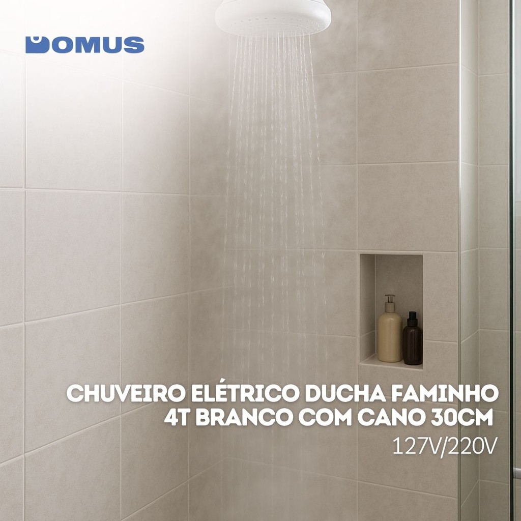 ***PRODUTO A PRONTA ENTREGA COM ENVIO IMEDIATO*** ITEM ORIGINAL COM NOTA FISCAL Somos a Domus, Loja oficial da Shopee. Temos 5 anos de experiência em E-Commerce e nosso maior objetivo é garantir a satisfação dos nossos clientes! Chuveiro Elétrico Ducha Faminho 4T Branco com Cano 30cm Fame | 4 Temperaturas, Alta Vazão e Segurança A Ducha Faminho 4T com Cano da Fame combina design inteligente, alta vazão de água e segurança para transformar seu banho em um momento de conforto. Equipada com 4 temperaturas, ela se adapta facilmente às diferentes estações do ano. Acompanha chuveirinho manual Quick com suporte e já vem com cano de 30 cm com rosca padrão ½, facilitando a instalação. Seu exclusivo sistema de encaixe da resistência proporciona facilidade na manutenção, enquanto o seletor com isolação reforçada garante máxima segurança durante o uso. Compatível com sistemas de aquecimento solar e dispositivos DR, a Ducha Faminho 4T com Cano é completa e eficiente, ideal para quem não abre mão de qualidade. Diferenciais do produto: 4 temperaturas: morna, quente, super quente e econômica Alta vazão de água: banho mais relaxante e eficiente Resistência com sistema de encaixe exclusivo: fácil substituição Seletor de temperatura com isolação: mais segurança no uso Acompanha chuveirinho manual com suporte: praticidade no dia a dia Cano FAME incluso: 30 cm com rosca padrão de ½ tipo gás Compatível com aquecimento solar e dispositivo DR (conforme NBR 5410) Especificações técnicas: Tensão: 127V ou 220V (não é bivolt) Potência: 127V – 5400W | 220V – 6800W Frequência: 60Hz Disjuntor: 127V – 43A | 220V – 32A Condutor mínimo: 127V – 10mm² | 220V – 4mm² Distância máxima do quadro: 127V – 26m | 220V – 25m Compatível com DR e sistema de aquecimento solar Código da resistência: 127V – 3862 | 220V – 3863 Cor: Branca Conteúdo da embalagem: 1 Ducha Elétrica Faminho 4T; 1 Chuveirinho manual Quick; 1 Suporte de fixação; 1 Cano de 30cm com rosca ½; 1 Manual de instruções Com instalação fácil, desempenho superior e máxima segurança, a Ducha Faminho 4T com Cano é a escolha ideal para o seu banho!