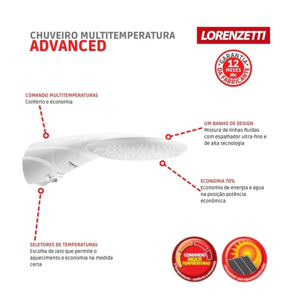 SOBRE O PRODUTO Sendo a última palavra em conforto e praticidade na hora do banho, a Ducha Advanced é ideal para todos os dias do ano. Através de seu controle multitemperaturas de , permite a seleção de até 4 temperaturas ideias para o o seu banho. Seu design inovador, possui um grande espalhador que proporciona excelente volume de água para o banho. Para completar a comodidade, a mudança de temperaturas está ao alcance das mãos, através de sua exclusiva haste prolongadora. A tecnologia de ponta da Ducha Advanced está em todos os detalhes, desde o design sem fiação aparente, com cano incorporado, resistência tipo refil, que facilita sua troca. Tudo para garantir uma fácil instalação. DIFERENCIAIS - Resistência de Troca Rápida: Tipo refil, fácil acesso - Grande Espalhador: Mais conforto no seu banho - Haste de comando (uso opcional): Troca de temperatura ao alcance das mãos - Design sem fiação aparente - A ducha é compatível com aquecedores solares, ampliando assim sua utilização. - Proteção Contra Choques. - Compatível com Dispositivo DR. CARACTERÍSTICAS TÉCNICAS - Pressão de funcionamento: 1 a 40 m.c.a. - Potência: 7500W - Tensão: 220V - Disjuntor: 40A - Fios: 6mm - Grau de Proteção: IP 24 - Sistema de Aterramento: Sim - Compatível com Dispositivo Diferencial Residual: Sim - Mangueira com Ducha Manual: Sim - Haste de Comando: Sim - Instalação sem cano: Sim - Compatível com aquecimento solar: Sim DIMENSÕES - Altura: 110mm - Largura: 230mm - Comprimento: 498mm CONTEÚDO DA EMBALAGEM - 1 Ducha Advanced Multitemperaturas - Mangueira - Ducha Manual - Suporte da Ducha Manual - Manual de Instruções GARANTIA Garantia: 12 meses (3 meses de garantia legal por lei, contando a partir da data de emissão da Nota Fiscal de Venda e 9 meses de garantia concedido pelo fabricante contra defeito de fabricação). SOBRE A FABRICANTE Com mais de 95 anos de trajetória marcada pela constante inovação, ética e pioneirismo, a Lorenzetti é líder no segmento de duchas, chuveiros, torneiras elétricas e aquecedores de água a gás. A empresa se destaca por colocar à disposição dos consumidores o que há de melhor em louças, assentos, metais e plásticos sanitários, purificadores de água, pressurizadores e lâmpadas, refletores, painéis e spots. Atenção: Certifique-se das especificações de Tensão e Potência adequadas ao local de uso. As especificações deste produto estão contidas no título do anúncio. Este modelo não acompanha cano para instalação