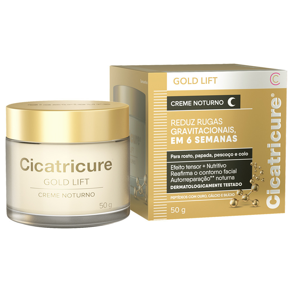 O peso líquido do conteúdo é de 50g. O Cicatricure Gold Lift Creme Noturno promove a recuperação da elasticidade e o processo de autorreparação noturno da pele, atuando durante a noite para criar uma camada que regula a perda de água. Indicado para rosto, pescoço e colo, o Cicatricure Gold Lift Creme Noturno reduz as rugas gravitacionais em 6 semanas de uso contínuo, melhorando a hidratação e aparência da pele. Formulado com Peptídeos com Ouro, Cálcio e Silício, o Cicatricure Gold Lift combina o poder dos peptídeos com Ouro, Cálcio e Silício, atuando na morfologia da pele, reduzindo a profundidade das rugas gravitacionais e redefinindo o contorno facial. Eficácia comprovada contra rugas verticais (entre sobrancelhas), rugas na região dos olhos (“pés de galinha”), “bigode chinês” e papada, atuando no nível da pele. Resultados com o uso do Cicatricure Gold Lift Creme Diurno e Creme Noturno. Modo de Uso: Aplicar à noite na pele limpa e seca com suave massagem ascendente no rosto, de dentro para fora. Aplicar também no colo, pescoço e papada.