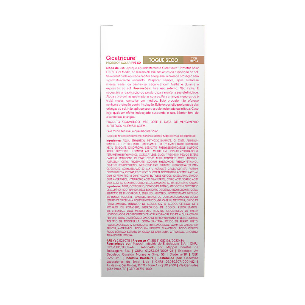 O peso líquido do conteúdo é de 40g. O Novo Cicatricure Protetor Solar FPS 50 com Cor Média protege a pele dos raios solares, ajudando a prevenir os sinais visíveis do envelhecimento causados pelo sol, como rugas, linhas de expressão e manchas solares. O Protetor Solar Cicatricure auxilia na prevenção dos sinais de envelhecimento relacionados à exposição solar, como manchas solares, rugas e linhas de expressão. Ele é dermatologicamente testado e resistente à água e ao suor. Nossa tecnologia foi desenvolvida para proporcionar uma alta proteção contra os raios UVA e UVB, utilizando Ácido Hialurônico e Pró-Colágeno em sua composição. O novo Protetor Solar Antissinais FPS 50 com cor oferece cobertura natural das imperfeições da pele, com um toque seco e efeito matte instantâneo. Modo de Uso: Aplique diariamente pela manhã e à tarde sobre a região desejada, massageando suavemente até completa absorção.