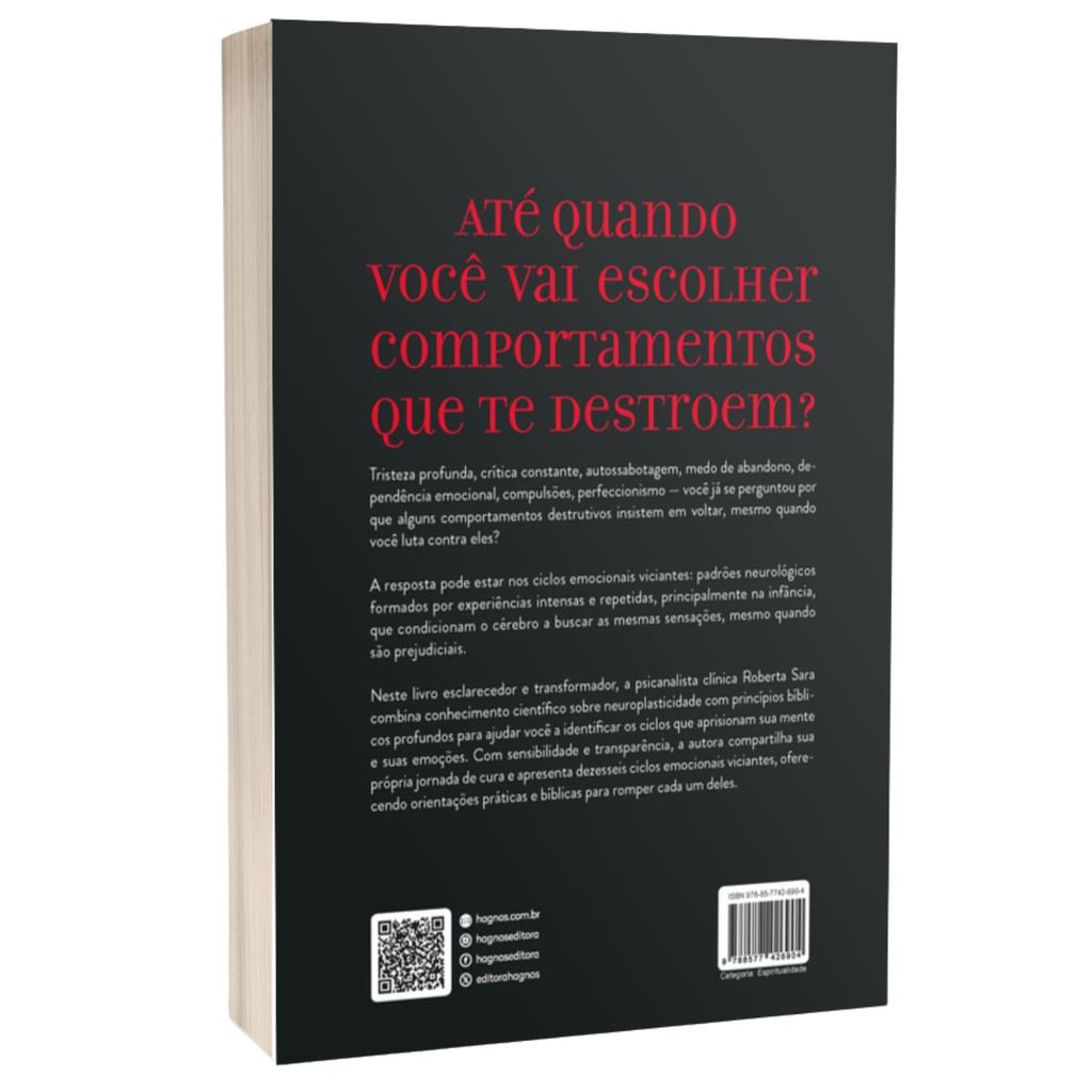 Roberta Sara Você já se perguntou por que repete os mesmos erros — mesmo quando promete que “da próxima vez será diferente”?Tristeza profunda, crítica constante, medo de rejeição, autossabotagem, dependência emocional, compulsões e perfeccionismo podem parecer lutas isoladas, mas na verdade fazem parte de ciclos emocionais viciantes: padrões neurológicos e afetivos que prendem sua mente em comportamentos destrutivos. Neste livro revelador, Roberta Sara, psicanalista clínica e especialista em saúde emocional com base cristã, mostra como experiências marcantes da infância moldam respostas emocionais automáticas — e como é possível reprogramar o cérebro por meio da neuroplasticidade e da renovação da mente pela Palavra de Deus. Com linguagem acessível e profunda, a autora apresenta dezesseis ciclos emocionais viciantes e ensina, passo a passo, como romper cada um deles, trazendo clareza, esperança e transformação real.Mais do que um livro, esta é uma jornada de autoconhecimento e cura que vai libertar você de emoções que escravizam e abrir espaço para uma vida plena em Cristo. Se você deseja compreender suas emoções, curar feridas internas e construir relacionamentos mais saudáveis — este livro é para você.Chegou a hora de identificar, enfrentar e romper os padrões que o mantêm preso ao passado.Liberte-se dos ciclos emocionais viciantes e viva a liberdade para a qual você foi criado. Ficha Técnica Autor: Roberta SaraSubtítulo: Liberte-se de comportamentos destrutivos e desfrute de uma vida plenaEditora: HagnosPáginas: 208Formato: 16x23cmPeso: 450gAcabamento: Capa DuraISBN: 9788577426904