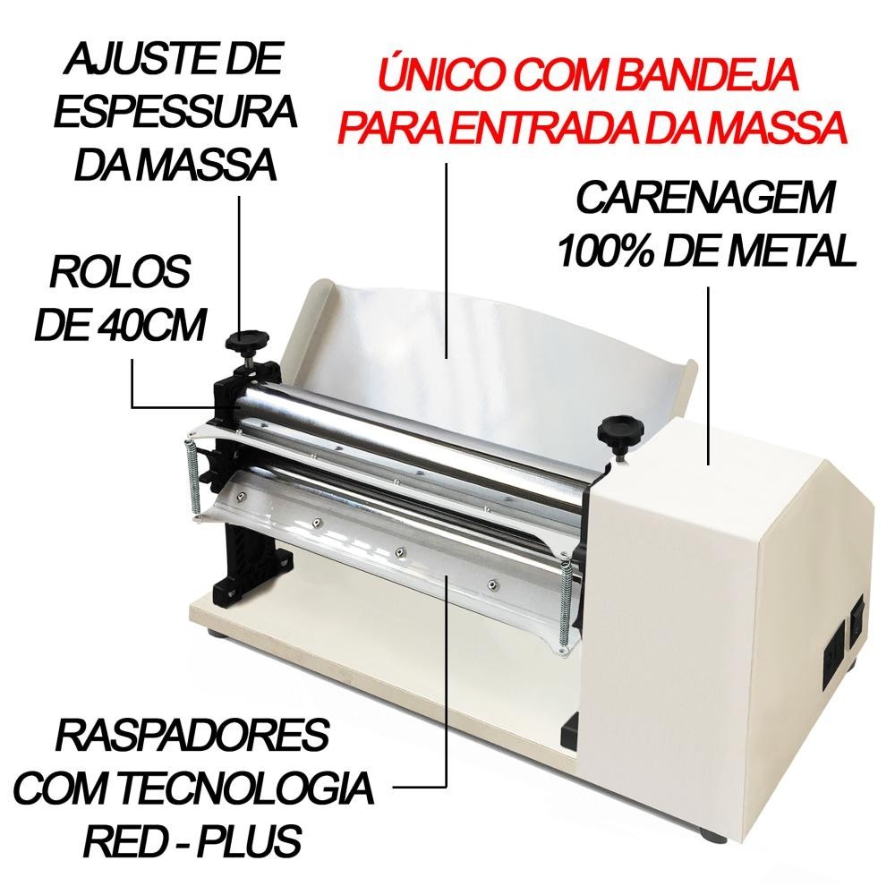 Este é o único cilindro da categoria com carenagem 100% de metal e rolos de 40cm, é a verdadeira revolução dos cilindros laminadores de massa. Como se fosse pouco, ele ainda é extremamente robusto e possui bandeja para entrada da massa, atribuindo mais agilidade e facilidade durante o uso. Especializado em laminar/cilindrar/sovar massas de todos os tipos, inclusive massa biscuit e pasta americana. Especificações - Comprimento: 45 cm - Largura: 25 cm - Altura: 25 cm - Possui sistema de segurança integrado de paralisação total - Lamina 20 metros de massa por minuto, grande produção em menos tempo - Possui raspadores para não grudar a massa, mantendo os rolos limpos durante e depois da utilização - Possui base em MDF laminado próprio para contato com o alimento. - Recomendação de Limpeza: Limpar com pano seco para retirar o pó. Não aplicar produtos abrasivos. - Produtos de Enfeite e Eletrônicos Não Estão Inclusos.