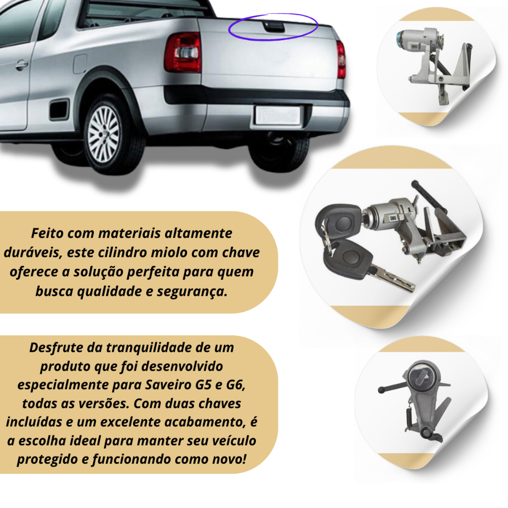 Cilindro Miolo com Chave para Maçaneta Externa da Tampa Traseira (Caçamba) - VW Saveiro G5 09-12 / Saveiro G6 13-19 Se o cilindro da tampa traseira da sua Saveiro está desgastado ou danificado, temos a solução perfeita para você! Nosso Cilindro Miolo com Chave foi desenvolvido com materiais de alta resistência e durabilidade, garantindo uma excelente reposição para seu veículo. Compatível com os modelos Saveiro G5 (2009-2012) e Saveiro G6 (2013-2019), ele oferece um acabamento de qualidade e vem com duas chaves (uma principal e uma reserva). Ideal para quem busca uma solução prática e de alta qualidade para substituição de peças desgastadas, esse cilindro proporciona uma instalação fácil e rápida, com a segurança e durabilidade que você precisa. Principais características: - Compatibilidade: VW Saveiro G5 (2008-2012) e Saveiro G6 (2013-2017), todas as versões - Material resistente: Fabricado com materiais duráveis para garantir maior vida útil - Chaves inclusas: Acompanha duas chaves, uma principal e outra reserva - Acabamento de qualidade: Ideal para reposição, com excelente ajuste e aparência - Garantia de 3 meses: Contra defeitos de fabricação Conteúdo da embalagem: - 1 Cilindro Miolo com 2 Chave para Tampa Traseira (Caçamba) Observações importantes: - Verifique a compatibilidade do produto com o seu veículo - Produto novo, indicado para reposição - Instalação recomendada por um profissional - Garantia do vendedor de 90 dias Este produto oferece a combinação perfeita entre qualidade e funcionalidade para manter sua Saveiro sempre em ótimo estado! Garantia do vendedor: 90 dias