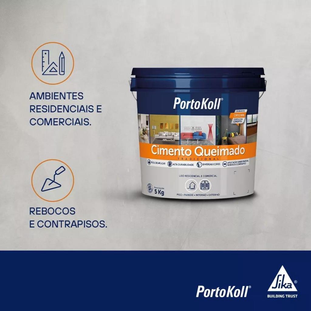 O Cimento Queimado PortoKoll® é uma argamassa colorida decorativa para o revestimento de pisos e paredes de áreas internas, externas e fachadas, que proporciona acabamento do tipo “cimento queimado” tradicional. O produto está disponível em várias cores, as quais devido à sua formulação especial, se mantém estáveis ao longo do tempo. INDICAÇÃO Para aplicação diretamente em sobre rebocos, contra piso e concreto, em ambientes residenciais e comerciais, tais como lojas e salas comerciais. É também indicado para aplicação sobre superfícies rústicas ou que já possuem pintura. COMPOSIÇÃO Cimentos especiais, pigmentos inorgânicos, agregados minerais de granulometria balanceada, aditivos químicos especiais não tóxicos e polímeros. LIMITAÇÕES, NÃO USAR: Fachadas; Garagens; Grandes áreas com alto tráfego; Sobre contrapiso ou emboço muito úmido, aguardar a base secar para iniciar a aplicação; Durante a aplicação, em base com temperatura menor que 5ºC e acima de 27ºC e temperaturas do ar entre 5°C e 40°C; Sobre base pouco firme, que apresenta fissuras, som cavo, descolamentos etc.; Após 40 minutos da mistura. RECOMENDAÇÃO TÉCNICA Limpar a superfície, removendo poeira, óleo, graxa, desmoldantes, nata de cimento ou outros resíduos que possam impedir a aderência do produto à base, lavando previamente com escova de aço e água. Problemas de fissura, juntas de concretagem, nichos de agregados, nivelamento, prumo e resistência devem ser corrigidos com 72 horas de antecedência ao uso do produto. Pisos de concreto deverão estar com no mínimo 28 dias de cura. Quando houver necessidade de aplicar sobre pisos cerâmicos, lajotas ou mosaicos, entrar em contato com o nossa Central de Relacionamento com o Cliente. Quando houver necessidade de aplicar sobre pisos cerâmicos, lajotas ou mosaicos, entrar em contato com o nossa Central de Relacionamento com o Cliente.