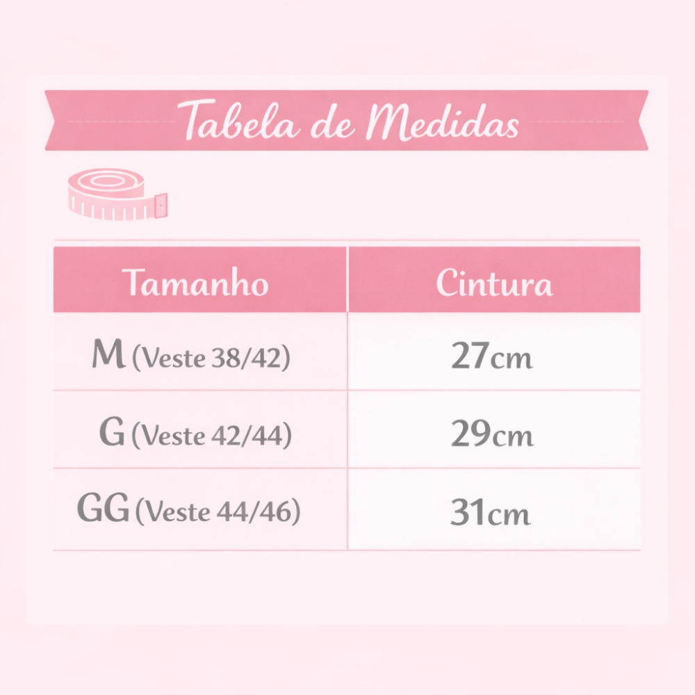 A cinta modeladora de compressão é ideal para quem deseja modelar a silhueta com conforto e praticidade. Produzida com material elástico e resistente, oferece compressão na medida certa, ajudando a valorizar as curvas e proporcionar um visual mais definido. Seu design garante conforto durante o uso e liberdade de movimentos, além de ser fácil de vestir e ajustar. Versátil, pode ser usada no dia a dia sob diferentes tipos de roupa, proporcionando mais segurança, sustentação e um caimento mais bonito. Tabela de Medidas: Tamanho P (Veste36/38) Cintura 25cm Tamanho M (Veste38/40) Cintura 27cm Tamanho G (Veste42/44) Cintura 29cm Tamanho GG (Veste44/46) Cintura 31cm