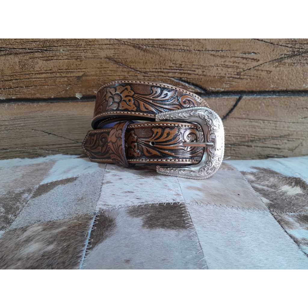 Cinto Country Em Couro Legitimo Rebaixo Floral Cowboy Feminino