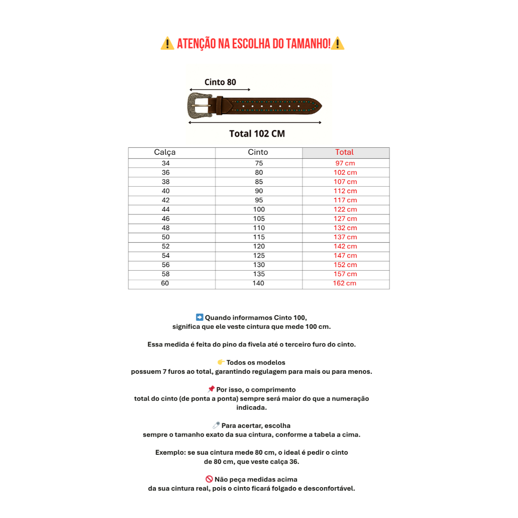 Couro 100% legítimo, acabamento impecável e brilho que impressiona! Perfeito para compor um look autêntico, cheio de estilo e atitude. ✅ Feminino ✅ Cravejado ✅ Alta durabilidade 📦 Envio rápido para todo o Brasil ⚠️ ATENÇÃO NA ESCOLHA DO TAMANHO! ⚠️ 🔴Sabemos que surgem muitas dúvidas na hora de escolher o tamanho do cinto. ➡️ Quando informamos Cinto 100, significa que ele veste cintura que mede 100 cm. Essa medida é feita do pino da fivela até o terceiro furo do cinto. 👉 Todos os modelos possuem 7 furos ao total, garantindo regulagem para mais ou para menos. 📌 Por isso, o comprimento total do cinto (de ponta a ponta) sempre será maior do que a numeração indicada. 🧷 Para acertar, escolha sempre o tamanho exato da sua cintura, conforme a tabela abaixo. Exemplo: se sua cintura mede 80 cm, o ideal é pedir o cinto de 80 cm, que veste calça 36. 🚫 Não peça medidas acima da sua cintura real, pois o cinto ficará folgado e desconfortável. 📏 Guia de Tamanhos – Cintos Calça 34 = Cinto 75 (Total de 97 cm) Calça 36 = Cinto 80 (Total de 102 cm) Calça 38 = Cinto 85 (Total de 107 cm) Calça 40 = Cinto 90 (Total de 112 cm) Calça 42 = Cinto 95 (Total de 117 cm) Calça 44 = Cinto 100 (Total de 122 cm) Calça 46 = Cinto 105 (Total de 127 cm) Calça 48 = Cinto 110 (Total de 132 cm) Calça 50 = Cinto 115 (Total de 137 cm) Calça 52 = Cinto 120 (Total de 142 cm) Calça 54 = Cinto 125 (Total de 147 cm) Calça 56 = Cinto 130 (Total de 152 cm) Calça 58 = Cinto 135 (Total de 157 cm) Calça 60 = Cinto 140 (Total de 162 cm) ➡️ Produto artesanal em couro legítimo. Por ser de origem animal, pode apresentar pequenas variações naturais. ❓ Perguntas Frequentes 1️⃣ O produto está disponível para envio imediato? Sim! Todos os modelos estão à pronta entrega e a postagem ocorre em até 12 horas úteis após a confirmação da compra. 2️⃣ Receberei o código de rastreio? Com certeza! Assim que o pedido for despachado, você terá acesso ao código para acompanhar cada etapa da entrega. ⸻ 📩 Ficou alguma dúvida? Deixe sua pergunta no campo de mensagens do anúncio que nossa equipe responderá rapidamente. ✨ Obrigado pela confiança e boas compras! Equipe Cintura Bruta 🤠