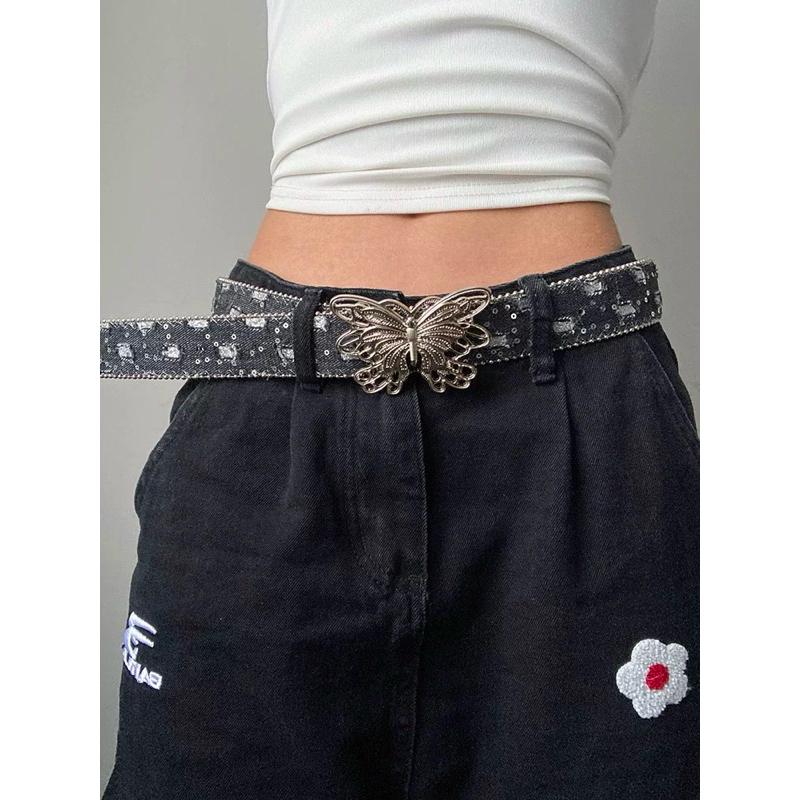 Cinto de Denim Preto de Feminino com Fivela Borboleta Grande e Contas, punk, y2k, Halloween