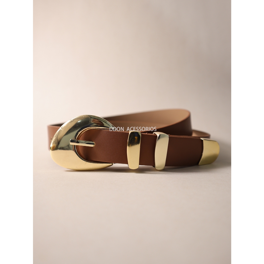 Cinto Feminino 2.4 CM Couro Sintetico Fivela Dourado com Dois Passador