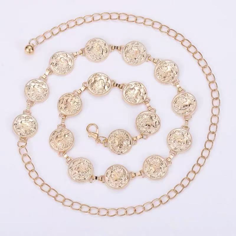 Cinto Feminino Corrente Moedas Dourado Prateado Ajustável Cinto de Cintura Metal Vintage Moda Festa Vestido