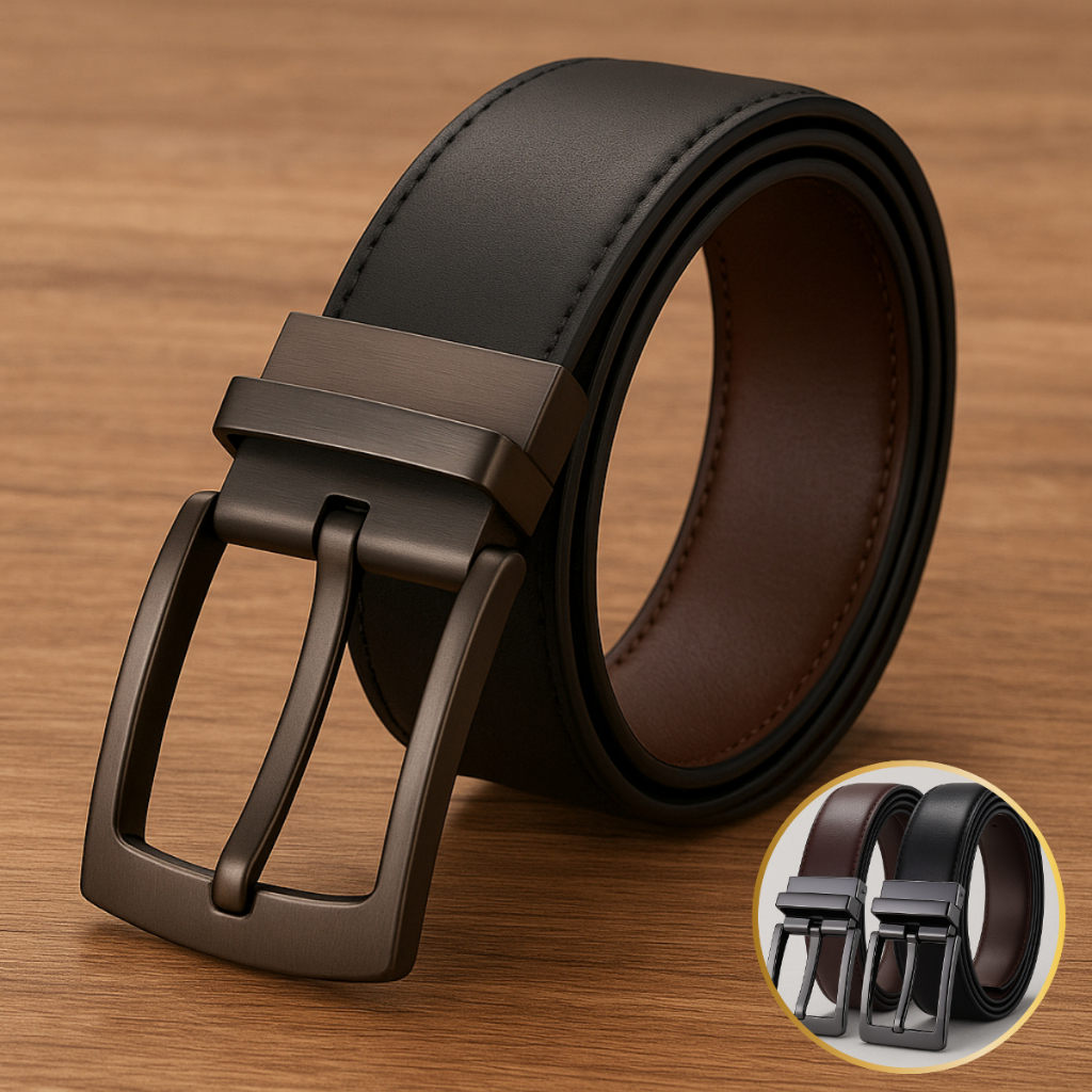 Cinto Masculino Dupla Face em Couro com Fivela Giratória Reversível Social Casual Confortável