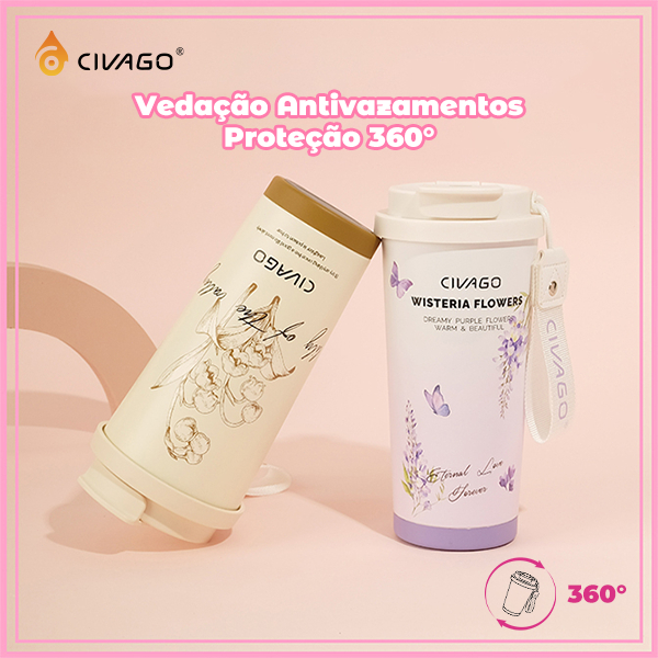 CIVAGO Copo Térmico 500ml com Alça de Tecido e Estampa Floral Garrafa Térmica Fashion Antivazamento 12h Quente/24h frio