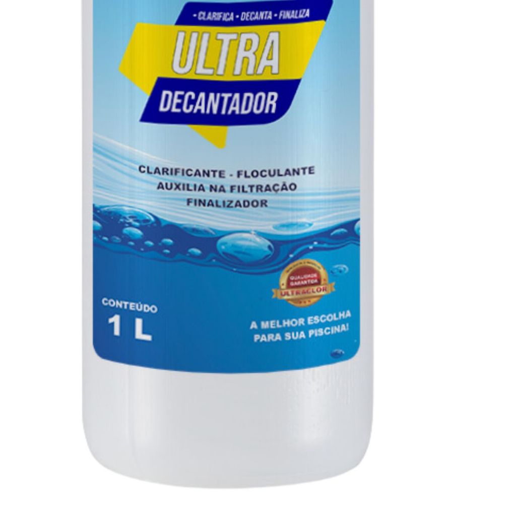 Ultradecantador Ultraclor 1 Litro Aglutina as partículas microscópicas em suspensão na água, formando flóculos maiores e mais pesados, que passam a ser retidos pelo meio filtrante ou descem para o fundo da piscina tornando a água totalmente cristalina.