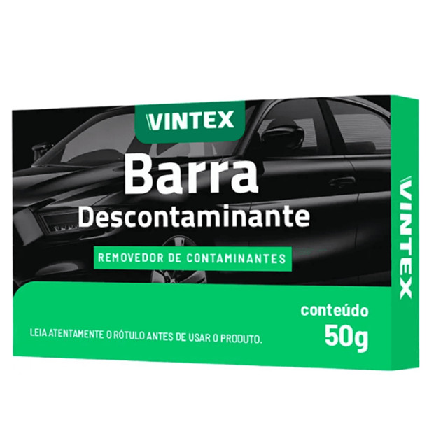 BARRA DESCONTAMINANTE 50G --------------------------------------------------------------------------------------- BARRA DESCONTAMINANTE VINTEX E UM PRODUTO DESENVOLVIDO ESPECIALMENTE PARA REMOCAO DE CONTAMINANTES NA PINTURA DO VEICULO, COMO PULVERIZACAO DE TINTAS, SEIVAS DE ARVORES, FEZES RECENTES DE PASSAROS, IMPACTOS DE INSETOS, POLUICAO INDUSTRIAL, PO DE FRIO, PIGMENTOS DE ASFALTO E RESIDUOS DIVERSOS QUE DANIFICAM A PINTURA, DEIXANDO-A ASPERA E SEM BRILHO. O PRODUTO PODE SER UTILIZADO EM PINTURA, VIDROS, BORRACHAS, CROMADAS E FAROIS. --------------------------------------------------------------------------------------- CONTEUDO NA EMBALAGEM: 1 NOTA FISCAL 1 BARRA DESCONTAMINANTE 50G --------------------------------------------------------------------------------------- CARACTERISTICAS DO PRODUTO: IMAGEM ILUSTRATIVA ALTA QUALIDADE E DURABILIDADE COD INTERNO DO PRODUTO: 11020722 PRODUTO RESISTENTE --------------------------------------------------------------------------------------- ANTES DE FINALIZAR A COMPRA: VERIFIQUE COM MUITA ATENCAO ATRAVES DAS FOTOS E DESCRICAO SE O PRODUTO E COMPATIVEL COM O MODELO QUE DESEJA ADQUIRIR. NOS NAO NOS RESPONSABILIZAMOS POR MA INSTALACAO OU MAU USO DO PRODUTO. PARA EVITAR TRANSTORNO PROCURE UM PROFISSIONAL ESPECIALIZADO.