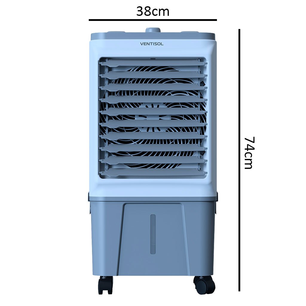 O Climatizador Ventisol possui reservatório de água que ajuda a repor umidade e a qualidade do ar, sem a necessidade de manter as portas e janelas fechadas, permitindo a renovação do ar no ambiente. Possui ainda filtro colmeia, que permite um resfriamento mais eficiente e combate as impurezas do ambiente, ajudando a evita doenças respiratórias ocasionadas pelo ar seco. - Filtro tipo colmeia: Resfria e limpa o ar do ambiente. - Reservatório de 16 litros: Abastecimento na tampa superior. - Compartimento de gelo: Se preferir, coloque gelo no reservatório da tampa superior para maior refrigeração. - Econômico: Baixo consumo de energia elétrica. Características: - 3 Níveis de ventilação. - Rodas deslizantes com trava. - Potência de 130w. - Peso: 5,7 kg - Largura: 30,0 cm - Altura: 76,0 cm - Comprimento: 39,0 cm - Voltagem: 127v