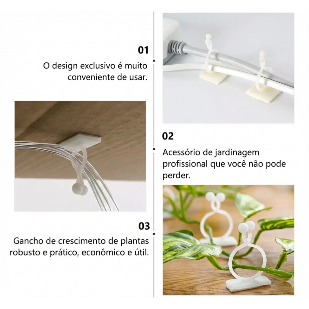 Kit de Fixadores para Plantas e Caules - Suporte Ultra-Resistente Mantenha suas plantas organizadas com praticidade e segurança. Este fixador é ideal para quem busca estabilidade para trepadeiras, jiboias e outras espécies que precisam de suporte para um crescimento saudável. Diferenciais do Produto: Alta Durabilidade: Fabricado em polímero de alta resistência. Adesivo Forte: Fixação duradoura em superfícies lisas (paredes, vidros, azulejos). Multiuso: Perfeito para organizar caules de plantas ou até mesmo fios e cabos leves. Fácil Aplicação: Sistema "cole e use". Especificações Técnicas: Tamanho: 2,7 x 2 x 2,3 cm. Cor: Branco. Garantia: 7 dias contra defeitos de fabricação.