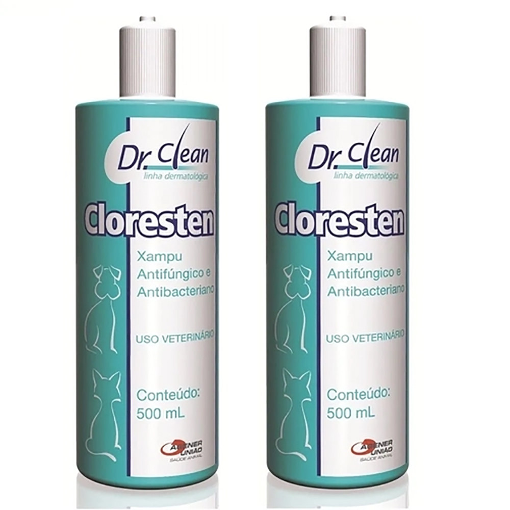 Cloresten Shampoo Agener União - 500mL - Indicado para cães e gatos; - Pelos e pele saúdaveis; - A base de clorexidine; - Animais de qualquer idade. Shampoo antibacteriano e antifúngico à base de clorexidine e miconazol. Indicado para cães e gatos no tratamento e controle das piodermites e micoses cutâneas dermatofitoses e malasseziose. Cloresten é um shampoo a base de Clorexidine a 2 % e miconazol a 2,5 %.S hampoo antifúngico e antibacteriano.Shampoo à base de clorexidine e miconazol é um derivado biguanidínico com reconhecidas propriedades, indicado para cães, gatos e equinos no tratamento e controle das infecções causadas por fungos e bactérias. Shampoo Cloresten 500ml O Shampoo Cloresten 500ml tem em sua composição as seguintes substâncias: Nitrato de Miconazol - 2,53g, Gluconato de Clorexidine (solução a 20%)* - 10,00ml, Essência Herbal - 0,20g, Veículo q.s.q - 100,00ml, (*)equivalente a 2.00g. Como já dito, o Shampoo Cloresten 500ml conta com clorexidine a 2% e miconazol a 2,5%, dando ainda mais eficiência ao produto. Muitas pessoas que utilizam frequentemente o Shampoo Cloresten 500ml indicam a sua compra, pois o mesmo apresenta extrema eficiência por um ótimo preço.