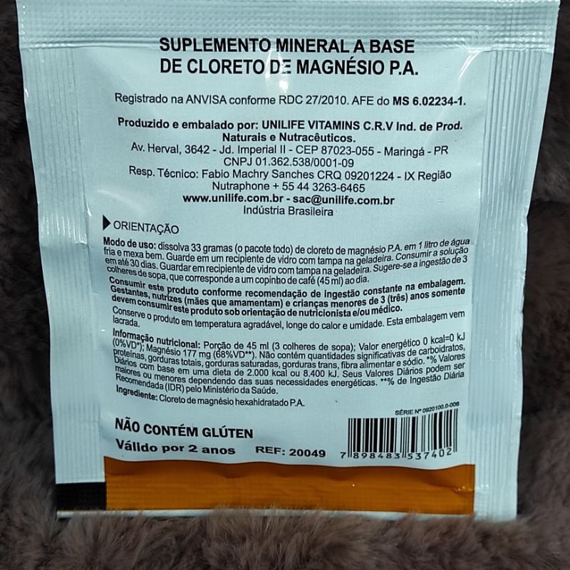 Cloreto de magnésio p.a para contrações musculares, sistema nervoso, ajuda a regular a pressão arterial e níveis de glicose.além de auxiliar o seu organismo. Modo de uso: dissolver 33g cloreto de magnésio p.a. em 1 litro de água fria( filtrada ou fervida), mexer bem , guardar em recipiente de vídro com tampa na geladeira. Sugere-se a ingestão de 3 colheres de sopa, que corresponde a um copinho de café ( 45ml) ao dia. consumir a solução em até 30 dias.