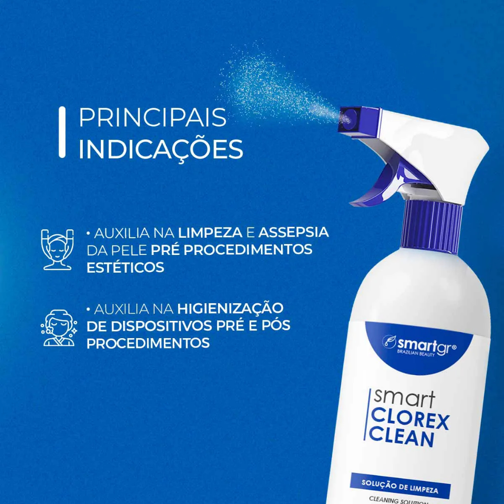 Smart Clorex Clean é um higienizante rico em ingredientes com ações fundamentais e necessárias para a limpeza da pele pré procedimentos estéticos, como: Microagulhamentos, Jato de Plasma, ou até mesmo para uma Limpeza de pele e Eletroterapias.