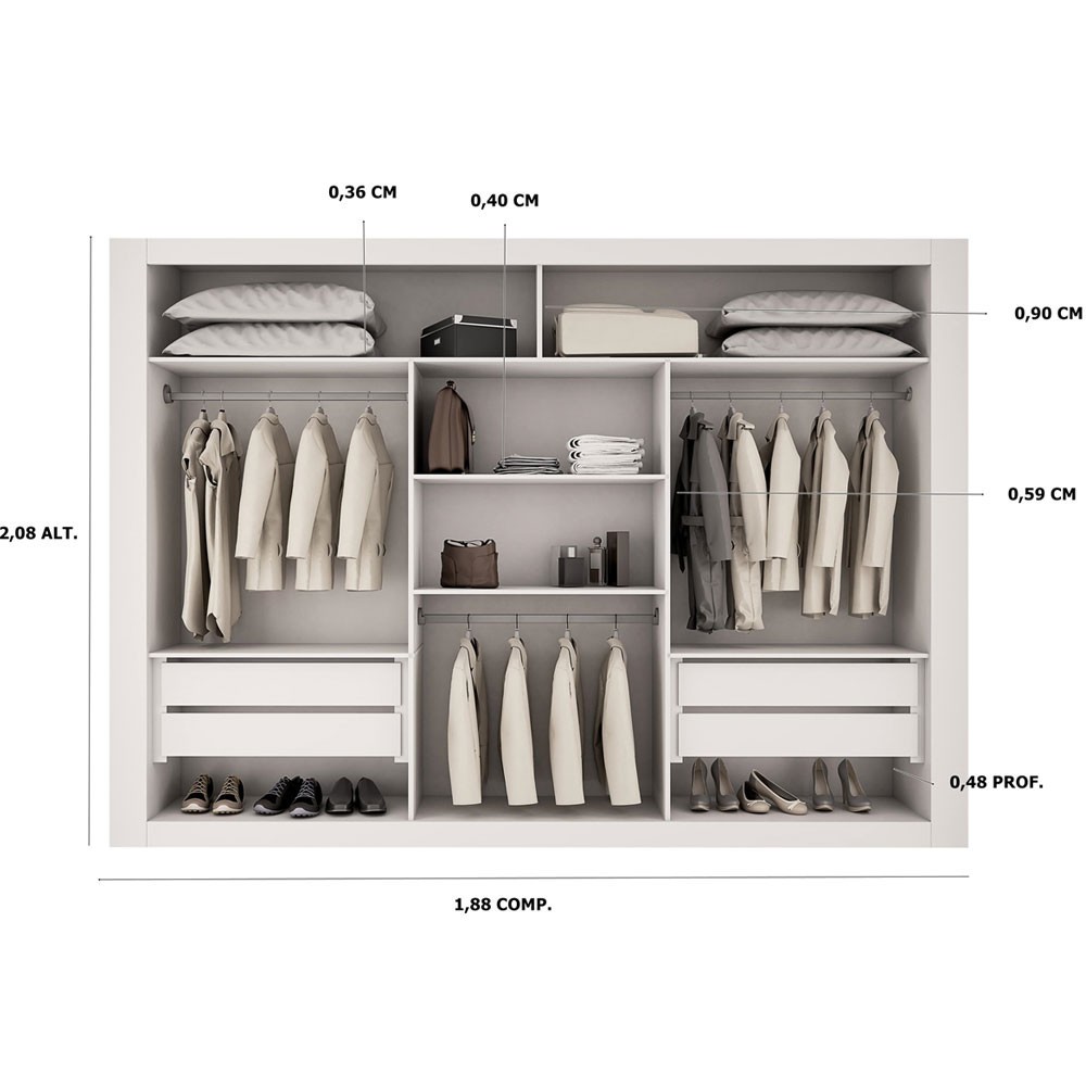 Closet Berlim Convencional 4 Gavetas Rufato Para quem busca praticidade no dia a dia sem abrir mão da elegância, o Closet Berlim é a escolha ideal. Produzido em 100% MDF, ele oferece uma excelente divisão interna, facilitando a organização de seus pertences e tornando o processo de se arrumar mais prazeroso e prático. Com design moderno e funcional, o Closet Berlim combina beleza e eficiência, elevando o padrão do seu espaço e trazendo um toque de sofisticação que seu ambiente precisa! Características: Necessária a montagem Material da Estrutura: MDF Tipo de Acabamento: Pintura Uv Possui Vidro: Não Dimensões do Closet: Altura: 208 cm Largura: 188 cm Profundidade: 48 cm Garantia do Fornecedor: 3 meses Informações Importantes: As tonalidades das cores podem sofrer alteração de acordo com a configuração de cada monitor. Os objetos que ambientam as fotos não acompanham o produto. Não disponibilizamos a montagem do produto. Não nos responsabilizamos por danos no produto causado por montagem. Verifique as dimensões do produto e certifique-se que o percurso que ele fará até o local de uso permite sua passagem. Para mais informações confira as políticas de entrega do site. Favor verificar o produto no ato da entrega e em caso de problemas decorrentes no transporte (arranhados, quebra, batida, amassados) deve-se efetuar a ressalva na nota fiscal para conhecimento da transportadora e comunicar imediatamente a loja. Moderna Mobília reserva o direito de alterar as especificações técnicas sem prévio aviso. As medidas contidas no site podem sofrer variações de acordo com a montagem, tipo de costura etc.