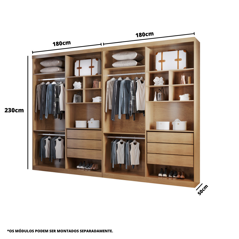 Closet Casal Fenix Premium 6 Gavetas 16 Prateleiras MDF Rufato O Closet Casal Fênix Premium é a escolha ideal para quem valoriza praticidade e elegância em seu espaço. Com uma estrutura robusta em 100% MDF, ele oferece um espaço generoso e uma divisão interna excepcional, incluindo 6 gavetas, 4 cabideiros e 16 prateleiras. As corrediças telescópicas garantem um manuseio suave e eficiente, tornando o processo de se arrumar mais prático e prazeroso, ao mesmo tempo em que eleva o padrão de organização e estilo do seu ambiente! Características: Material da Estrutura: 100%MDF Tipo de Acabamento: Pintura UV Material das Corrediças: Telescópica Material dos Cabideiros: Alumínio Este modelo não contém portas Dimensões de cada Módulo: Altura: 230 cm Largura: 180 cm Profundidade: 50 cm Peso: 107,5 Garantia do Fornecedor: 3 meses Informações Importantes: As tonalidades das cores podem sofrer alteração de acordo com a configuração de cada monitor. Os objetos que ambientam as fotos não acompanham o produto. Não disponibilizamos a montagem do produto. Não nos responsabilizamos por danos no produto causado por montagem. Verifique as dimensões do produto e certifique-se que o percurso que ele fará até o local de uso permite sua passagem. Para mais informações confira as políticas de entrega do site. Favor verificar o produto no ato da entrega e em caso de problemas decorrentes no transporte (arranhados, quebra, batida, amassados) deve-se efetuar a ressalva na nota fiscal para conhecimento da transportadora e comunicar imediatamente a loja. Moderna Mobília reserva o direito de alterar as especificações técnicas sem prévio aviso. As medidas contidas no site podem sofrer variações de acordo com a montagem, tipo de costura etc.