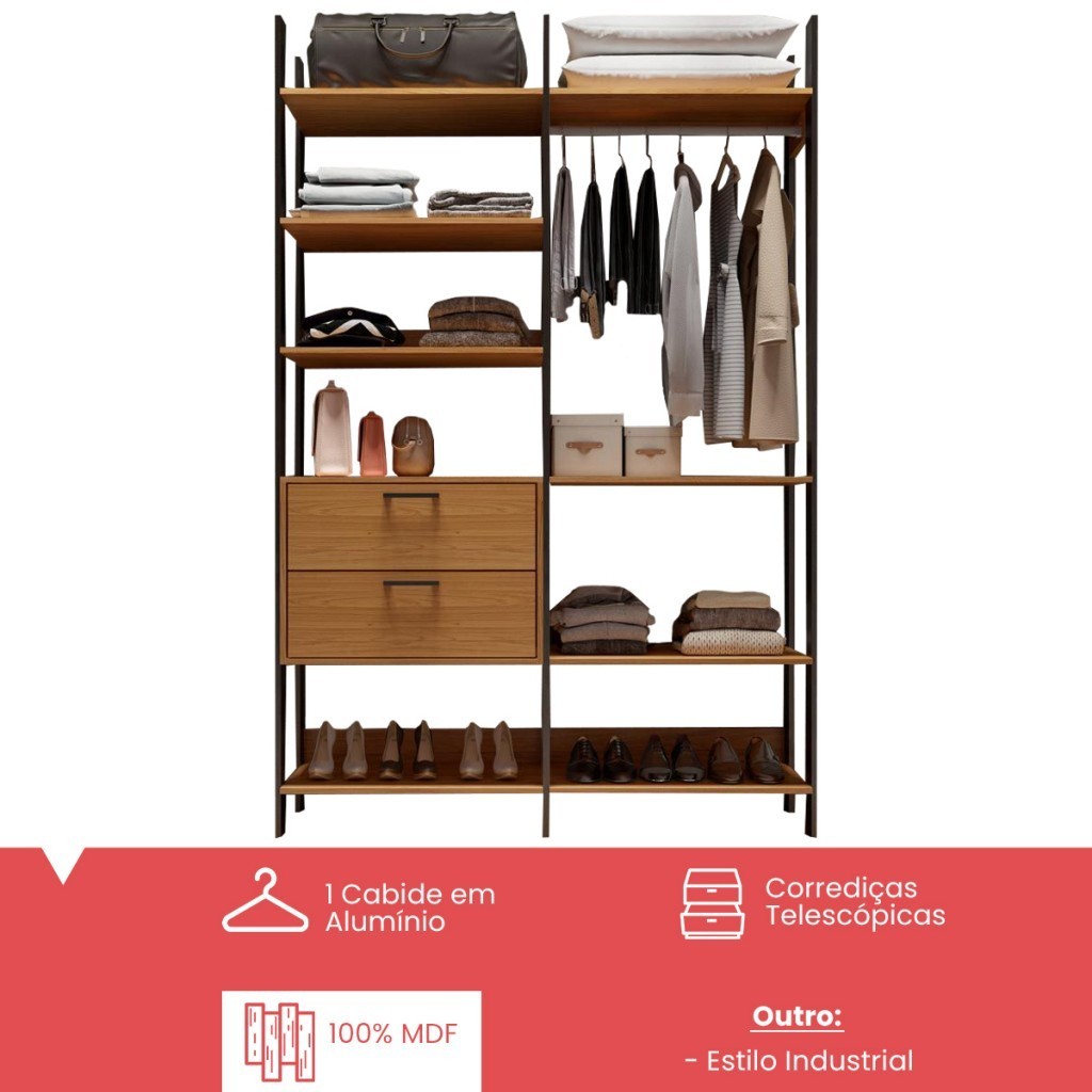Closet Marselha 100% Mdf 2 Gavetas 8 Prateleiras Freijó/Preto - Panorama Móveis