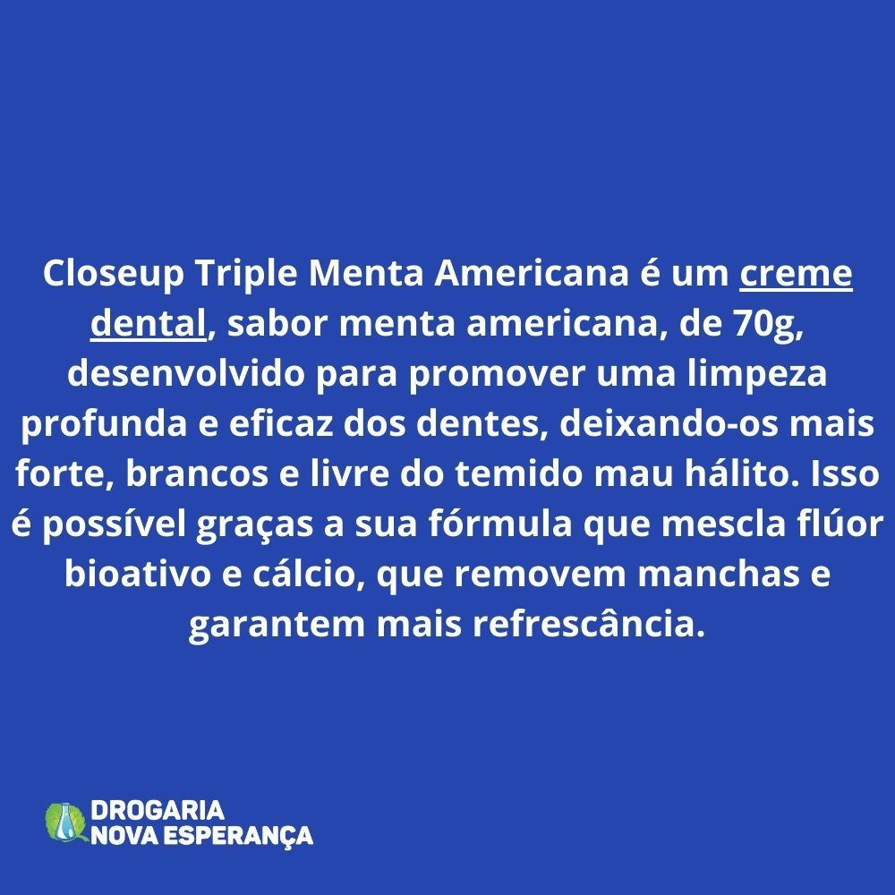 Closeup Triple Menta Americana é um creme dental indicado para: - Promover uma limpeza profunda e eficaz dos dentes, deixando-os mais forte, brancos e livres do temido mau hálito.