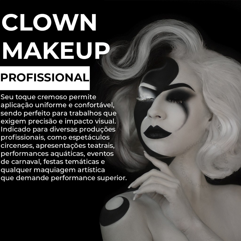 CLOWN MAKEUP 60g Resistente à água e à transpiração, possui alta cobertura, longa duração e pigmentação intensa. É ideal para profissionais que necessitam de um produto de alta performance, como por exemplo: artistas de circo, teatro, apresentações aquáticas, carnaval e demais maquiagens. ESPECIFICAÇÕES Embalagens individuais de 60g, disponíveis em 15 cores: Amarelo, Azul, Branco, Cor de Pele n° 1, Cor de Pele n° 2, Cor de Pele n° 3, Laranja, Marrom, Pink, Preto, Roxo, Verde, Vermelho, Ouro e Prata. MODO DE USO Com uma esponja ou pincel, aplique o clown makeup nas áreas desejadas do corpo e rosto. Em seguida, sele com Pó Translúcido Colormake. COMO REMOVER Utilize demaquilante Colormake.