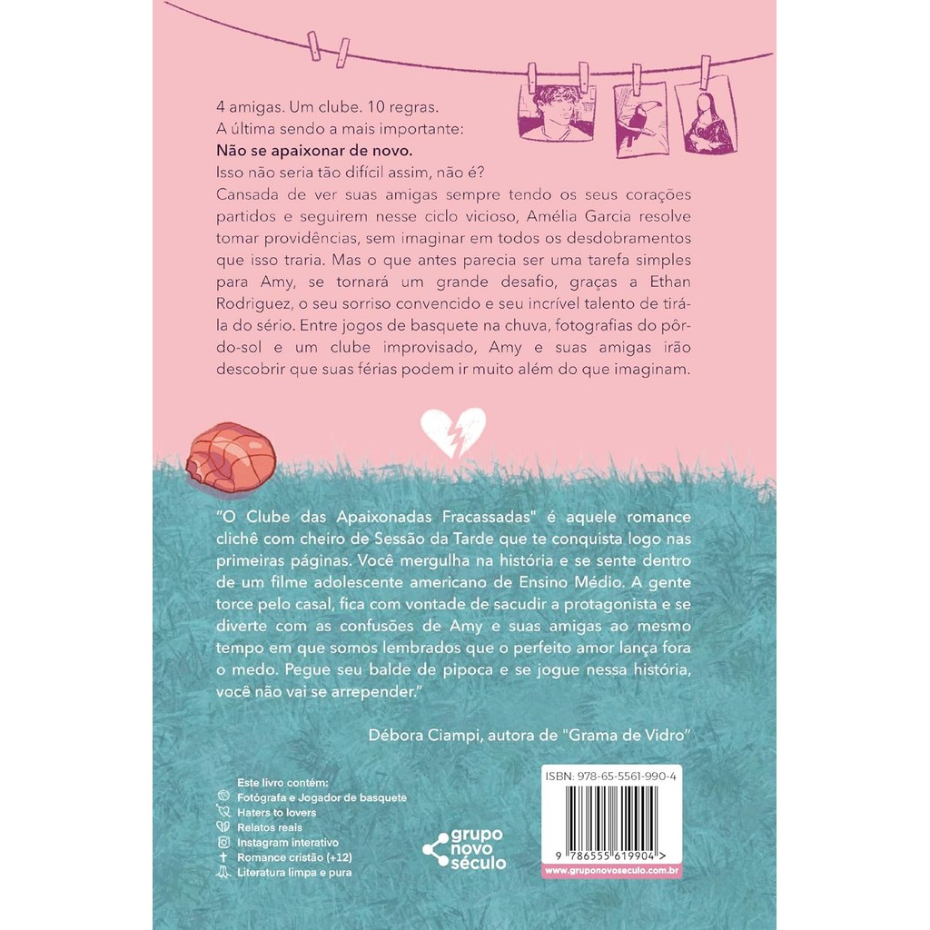 4 amigas. Um clube. 10 regras. A última sendo a mais importante: não se apaixonar de novo. Isso não seria tão difícil assim, não é? Cansada de ver suas amigas sempre tendo os seus corações partidos e seguirem nesse ciclo vicioso, Amélia Garcia resolve tomar providências, sem imaginar em todos os desdobramentos que isso traria. Mas o que antes parecia ser uma tarefa simples para Amy, se tornará um grande desafio, graças a Ethan Rodriguez, o seu sorriso convencido e seu incrível talento de tirá-la do sério. Entre jogos de basquete na chuva, fotografias do pôr-do-sol e um clube improvisado, Amy e suas amigas irão descobrir que suas férias podem ir muito além do que imaginam. • Uma história sobre amizade, autoconhecimento e o lado agridoce do amor jovem. • Ideal para fãs de romances adolescentes e narrativas divertidas sobre relacionamentos. • Texto leve, com humor afiado e personagens cativantes. • Representatividade de diferentes perfis de meninas e seus dilemas afetivos. • Reflexão sobre autoestima, amadurecimento e a importância das amizades verdadeiras. Este livro contém: • Fotográfa e jogador de basquete; • Haters to lovers; • Relatos reais; • Instagram interativo; • Romance cristão; • Literatura limpa e pura;