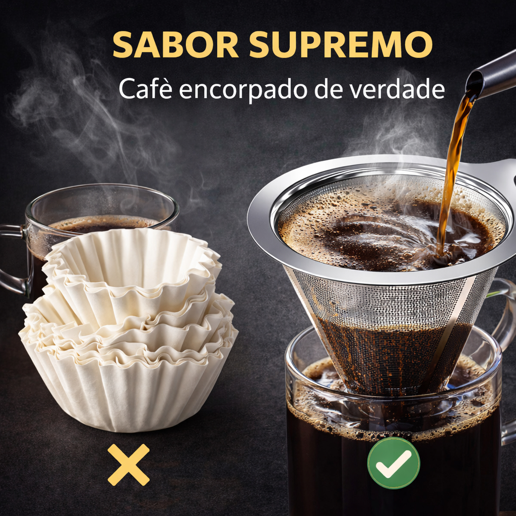 Filtre Royale™ – Coador de Café Inox 103 Permanente Transforme seu café diário em uma experiência premium e pare de gastar dinheiro com filtro de papel para sempre. O Filtre Royale™ é um coador permanente em aço inox 103, desenvolvido para quem busca economia, durabilidade e um café mais encorpado. Sua malha ultrafina preserva os óleos naturais do café, garantindo mais aroma, mais sabor e muito mais intensidade na xícara. Chega de filtros rasgando, acabando na pior hora ou alterando o gosto do café. Com o Filtre Royale™, você tem liberdade total para preparar seu café todos os dias, sem desperdício e sem preocupação. ✅ Principais Benefícios ✔ Permanente e reutilizável – economia vitalícia ✔ Malha fina 103 – não deixa passar pó ✔ Aço inox premium – não enferruja ✔ Fácil de limpar – basta enxaguar ✔ Sustentável – zero descarte de papel ✔ Café mais encorpado e aromático ✔ Estrutura reforçada e durável 🔥 Por que escolher o Filtre Royale™? Diferente dos filtros comuns de papel que absorvem os óleos naturais do café, o Filtre Royale™ mantém a essência do grão, proporcionando uma bebida mais rica e intensa. Além disso, você elimina gastos mensais com filtros descartáveis. Um único investimento que dura anos. 📏 Especificações Técnicas • Modelo: 103 • Material: Aço Inox • Tipo: Permanente e reutilizável • Compatível com suportes padrão 103 • Lavável e fácil manutenção 🌱 Sustentável e Econômico Reduza o lixo diário e faça uma escolha mais consciente sem abrir mão do sabor perfeito.