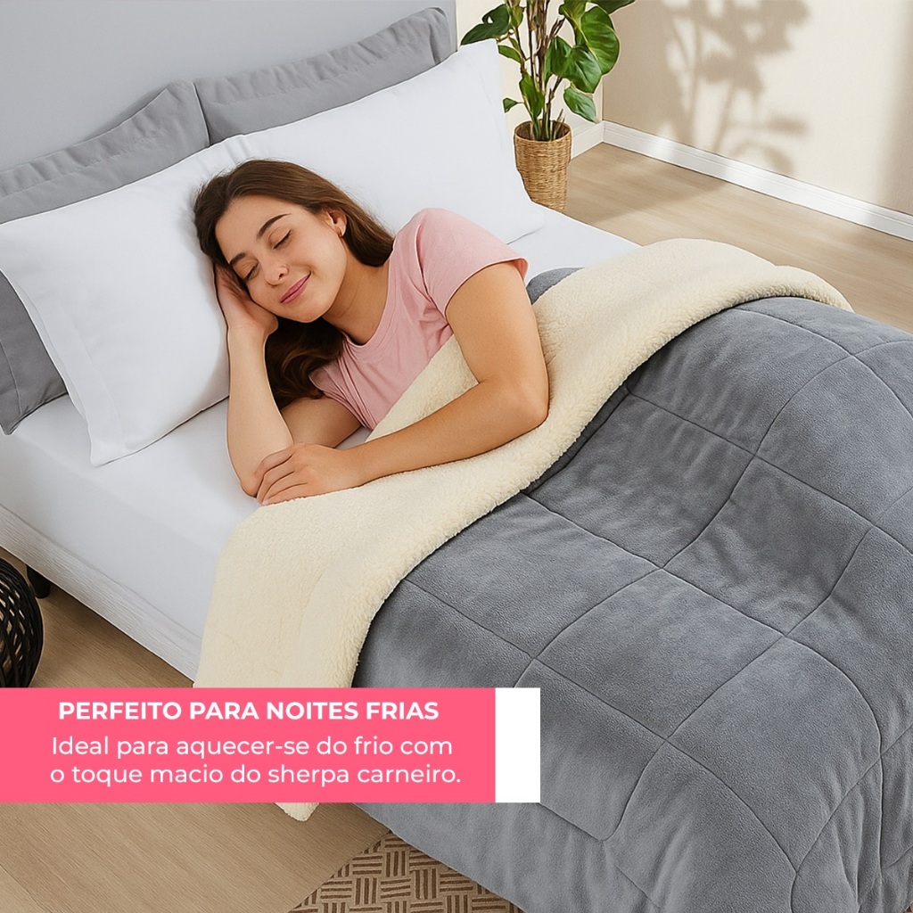 Com um visual elegante e acabamento de alto padrão, ele combina a suavidade da manta em microfibra com o conforto térmico do tecido Sherpa. A proposta é simples: um coberdrom que oferece calor na medida certa, sem abrir mão da leveza. Ideal para transformar o visual do quarto e proporcionar um sono ainda mais aconchegante e reparador. Especificações do Produto: Solteiro 01 Coberdrom: 2,40m x 1,50m Queen 01 Coberdrom: 2,40m x 2,20m King 01 Coberdrom: 2,60m x 2,40m Composição: Tecido Sherpa: 100% Poliéster Enchimento: 100% Poliéster Manta Microfibra Flannel: 100% Poliéster Destaques do Produto: Conforto Extra: Mistura perfeita de aquecimento e leveza para noites mais tranquilas. Toque Macio e Aveludado: Sensação acolhedora que imita a lã, sem causar desconforto. Visual Sofisticado: Acabamento de qualidade e cores elegantes que elevam o visual da sua cama. Ideal para: Quem valoriza conforto térmico e deseja um cobertor com excelente custo-benefício. Ambientes que pedem um toque de requinte e suavidade no décor. Presentes de inverno com alto potencial de encantar e acolher. Atenção: As cores do produto podem sofrer pequenas variações devido à configuração da tela do seu dispositivo.