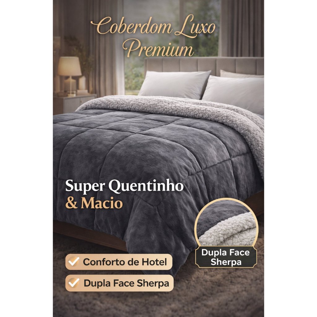 Mais conforto, mais calor, mais qualidade para suas noites! O coberdom sherpa premium é ideal para quem busca um cobertor mais encorpado, extremamente macio e perfeito para o inverno. Com acabamento sofisticado e toque aveludado, ele transforma sua cama em um ambiente aconchegante e elegante todos os dias. POR QUE ESCOLHER ESSE COBERDOM? ✔ Mais grosso que cobertores comuns ✔ Aquecimento ideal para dias frios ✔ Dupla face: beleza + conforto ✔ Toque macio e agradável ✔ Não solta pelo ✔ Excelente caimento na cama MEDIDAS: Aproximadamente: 2,40m x 2,20m Cobre bem camas de casal e Queen COMPOSIÇÃO: Parte superior: manta soft (aveludada) Parte inferior: sherpa (tipo lã de carneiro) CUIDADOS: ✔ Lavagem na máquina ✔ Secagem rápida ✔ Não precisa passar INCLUSO: 01 Coberdom Sherpa Premium INDICADO PARA: ✔ Inverno ✔ Deixar sua cama mais bonita ✔ Presentear ✔ Quem busca conforto e qualidade Envio Imediato!