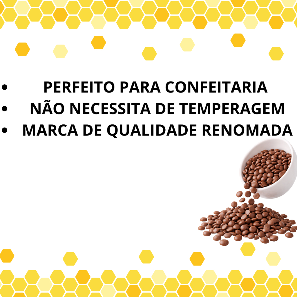 A versão em gotas traz mais praticidade, pois não é preciso picar a cobertura para derretê-la! Durante o derretimento, controle para que a cobertura não ultrapasse os 50 °C, temperatura em que o açúcar começa a queimar, comprometendo a fluidez. Banhe pães de mel, trufas ou molde bombons e ovos de Páscoa com o Confeiteiro entre 38 °C e 42 °C. Depois, leve as peças à geladeira até que sequem ou até que o molde fique opaco, garantindo brilho e estabilidade. Utilize sempre um termômetro culinário para garantir que o manuseio foi correto. Derretimento: 45 °C a 50 °C Temperatura de uso: 38 °C a 42 °C ALÉRGICOS: CONTÉM DERIVADOS DE LEITE E DE SOJA. CONTÉM LACTOSE. NÃO CONTÉM GLÚTEN. Ingredientes: açúcar, gordura vegetal, cacau em pó, soro de leite em pó, emulsificantes: lecitina de soja e esteres de ácido ricinoleico interesterificado com poli glicerol e aromatizantes. INFORMAÇÃO NUTRICIONAL: Porção de 25g Valor Energético 137 kcal/547 kJ Carboidratos 16g Açúcares totais 16g Açúcares adicionados 16g Proteínas 0,4g Gorduras totais 7,8g Gorduras saturadas 7,3g Gorduras trans 0,1g Fibra alimentar 0,3g Sódio 2,2mg Somos uma loja especializada em artigos de festa, confeitaria, embalagens e doces com lojas físicas no estado de São Paulo, desde 2002. Imagens meramente ilustrativas. Todas as Informações divulgadas são de responsabilidade do fabricante/fornecedor.