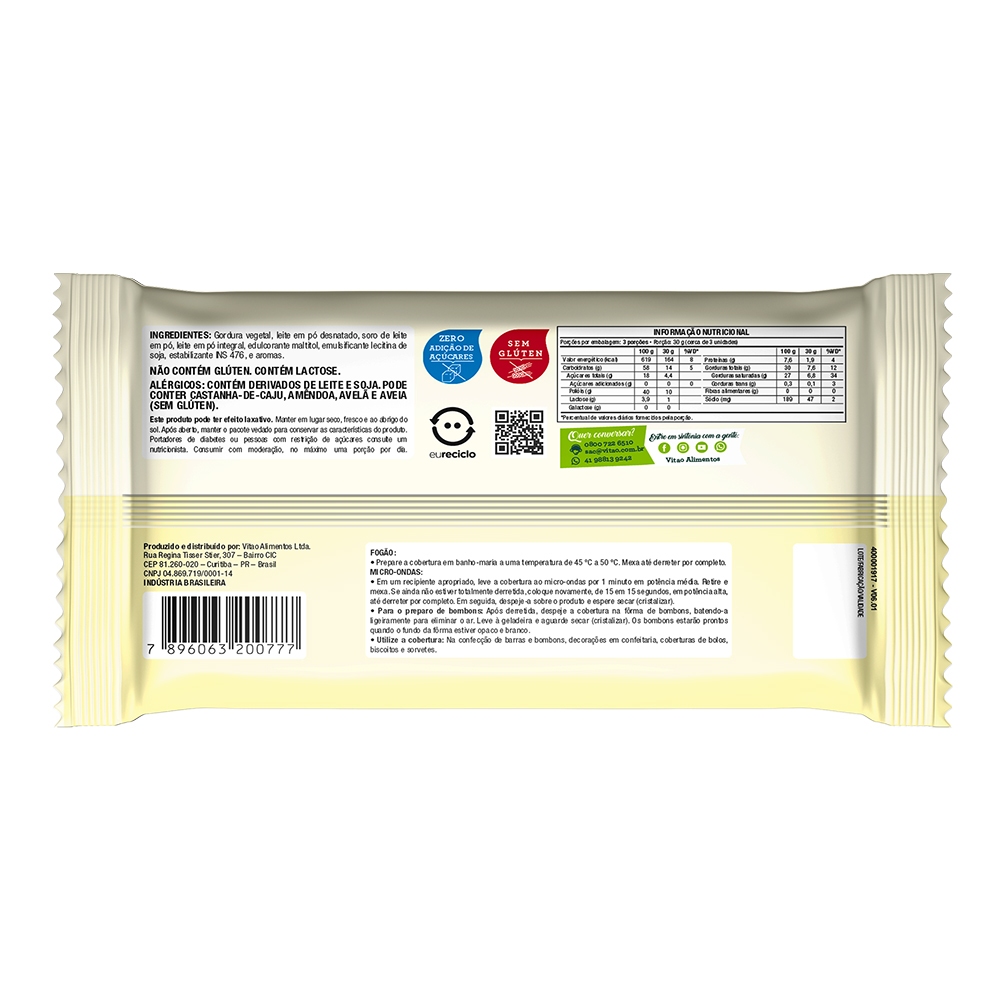 Desfrute da suavidade e pureza da Cobertura de Chocolate Branco Vitao 1,01 Kg. Com um sabor equilibrado e envolvente, esta cobertura é cuidadosamente elaborada para proporcionar uma experiência única aos apreciadores de chocolate branco, sem adição de açúcar e sem glúten. Desenvolvida para uso profissional no setor de alimentação, a cobertura da Vitao destaca-se por sua versatilidade em diversas receitas, desde confeitaria até sobremesas gourmet. Sua textura cremosa e sabor inconfundível fazem dela uma escolha premium para elevar o padrão das suas criações culinárias. Descubra a excelência desta cobertura e adicione um toque refinado e irresistível aos seus pratos. MODO DE PREPARO: FOGÃO: • Prepare a cobertura em banho-maria a uma temperatura de 45 ºC a 50 ºC. Mexa até derreter por completo. MICRO-ONDAS: • Em um recipiente apropriado, leve a cobertura ao micro-ondas por 1 minuto em potência média. Retire e mexa. Se ainda não estiver totalmente derretida, coloque novamente, de 15 em 15 segundos, em potência alta, até derreter por completo. Em seguida, despeje-a sobre o produto e espere secar (cristalizar). • Para o preparo de bombons: Após derretida, despeje a cobertura na fôrma de bombons, batendo-a ligeiramente para eliminar o ar. Leve à geladeira e aguarde secar (cristalizar). Os bombons estarão prontos quando o fundo da fôrma estiver opaco e branco. • Utilize a cobertura: Na confecção de barras e bombons, decorações em confeitaria, coberturas de bolos, biscoitos e sorvetes.. INGREDIENTES: Gordura vegetal, leite em pó desnatado, soro de leite em pó, leite em pó integral, edulcorante maltitol, emulsificante lecitina de soja, estabilizante INS 476 e aromas. ALÉRGICOS: CONTÉM DERIVADOS DE LEITE E SOJA. PODE CONTER CASTANHA-DE-CAJU, AMÊNDOA, AVELÃ E AVEIA (SEM GLÚTEN). NÃO CONTÉM GLÚTEN. CONTÉM LACTOSE. SEM GLÚTEN, ZERO ADIÇÃO DE AÇÚCARES.