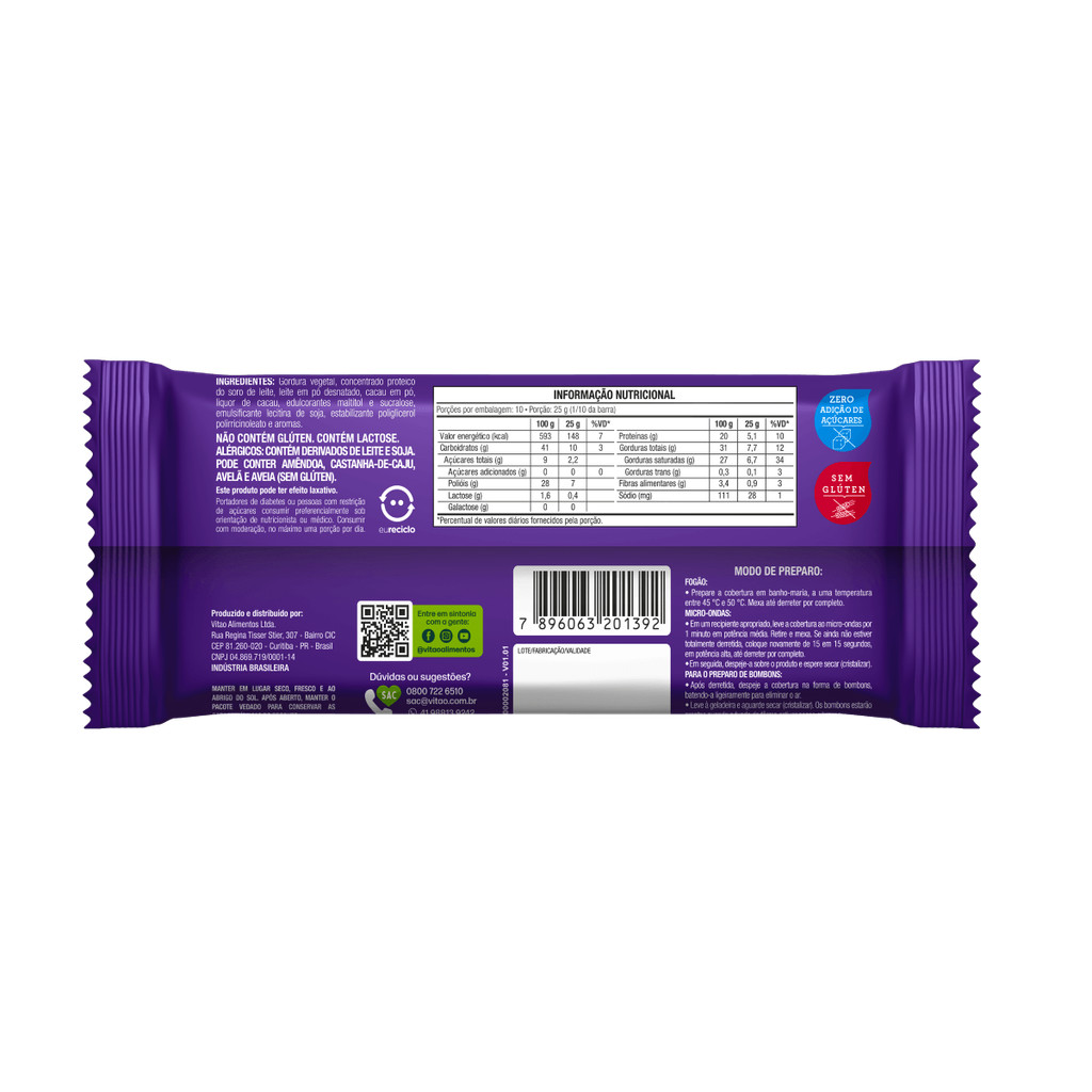 A Cobertura sabor chocolate ao leite zero da SoulPro é uma opção deliciosa e saudável, especialmente desenvolvida para o segmento de food service. Elaborada com ingredientes de alta qualidade, proporciona o irresistível sabor do chocolate ao leite e se destaca por ser rica em proteínas, oferecendo 5g por porção. Ideal para estabelecimentos que buscam uma alternativa nutritiva e sem adição de açúcares, essa cobertura é a escolha perfeita para quem deseja oferecer aos clientes um deleite saboroso e saudável. NÃO NECESSITA TEMPERAGEM MODO DE PREPARO: FOGÃO: • Prepare a cobertura em banho-maria, a uma temperatura entre 45 °C e 50 °C. Mexa até derreter por completo. MICRO-ONDAS: • Em um recipiente apropriado, leve a cobertura ao micro-ondas por 1 minuto em potência média. Retire e mexa. Se ainda não estiver totalmente derretida, coloque novamente de 15 em 15 segundos, em potência alta, até derreter por completo. • Em seguida, despeje-a sobre o produto e espere secar (cristalizar). PARA O PREPARO DE BOMBONS: • Após derretida, despeje a cobertura na forma de bombons, batendo-a ligeiramente para eliminar o ar. • Leve à geladeira e aguarde secar (cristalizar). Os bombons estarão prontos quando o fundo da fôrma estiver opaco e branco. INGREDIENTES: Gordura vegetal, concentrado proteico do soro de leite, leite em pó desnatado, cacau em pó, liquor de cacau, edulcorantes maltitol e sucralose, emulsificante lecitina de soja, estabilizante poliglicerol polirricinoleato e aromas. ALÉRGICOS: CONTÉM DERIVADOS DE LEITE E SOJA. PODE CONTER AMÊNDOA, CASTANHA-DE-CAJU, AVELÃ E AVEIA (SEM GLÚTEN). NÃO CONTÉM GLÚTEN. CONTÉM LACTOSE. SEM GLÚTEN, ZERO ADIÇÃO DE AÇÚCARES, PROTEICO.