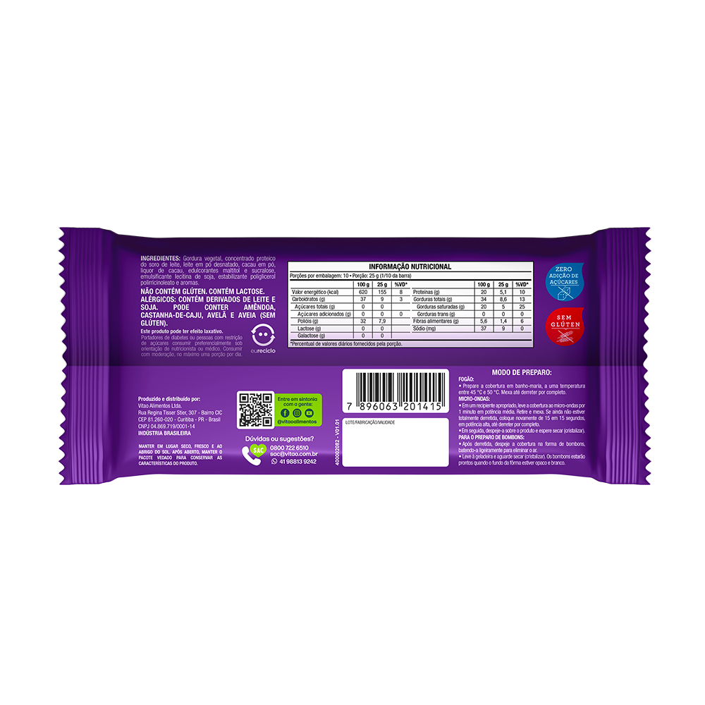 A Cobertura Sabor Chocolate Meio Amargo Zero da SoulPro é uma opção deliciosa e saudável, especialmente desenvolvida para o segmento de food service. Elaborada com ingredientes de alta qualidade, proporciona o irresistível sabor do chocolate meio amargo e se destaca por ser rica em proteínas, oferecendo 5g por porção. Ideal para estabelecimentos que buscam uma alternativa nutritiva e sem adição de açúcares, essa cobertura é a escolha perfeita para quem deseja oferecer aos clientes um deleite saboroso e saudável. NÃO NECESSITA TEMPERAGEM MODO DE PREPARO: FOGÃO: • Prepare a cobertura em banho-maria, a uma temperatura entre 45 °C e 50 °C. Mexa até derreter por completo. MICRO-ONDAS: • Em um recipiente apropriado, leve a cobertura ao micro-ondas por 1 minuto em potência média. Retire e mexa. Se ainda não estiver totalmente derretida, coloque novamente de 15 em 15 segundos, em potência alta, até derreter por completo. • Em seguida, despeje-a sobre o produto e espere secar (cristalizar). PARA O PREPARO DE BOMBONS: • Após derretida, despeje a cobertura na forma de bombons, batendo-a ligeiramente para eliminar o ar. • Leve à geladeira e aguarde secar (cristalizar). Os bombons estarão prontos quando o fundo da fôrma estiver opaco e branco. INGREDIENTES: Gordura vegetal, concentrado proteico do soro de leite, leite em pó desnatado, cacau em pó, liquor de cacau, edulcorantes maltitol e sucralose, emulsificante lecitina de soja, estabilizante poliglicerol polirricinoleato e aromas. ALÉRGICOS: CONTÉM DERIVADOS DE LEITE E SOJA. PODE CONTER AMÊNDOA, CASTANHA-DE-CAJU, AVELÃ E AVEIA (SEM GLÚTEN). NÃO CONTÉM GLÚTEN. CONTÉM LACTOSE. SEM GLÚTEN, ZERO ADIÇÃO DE AÇÚCARES, PROTEICO.