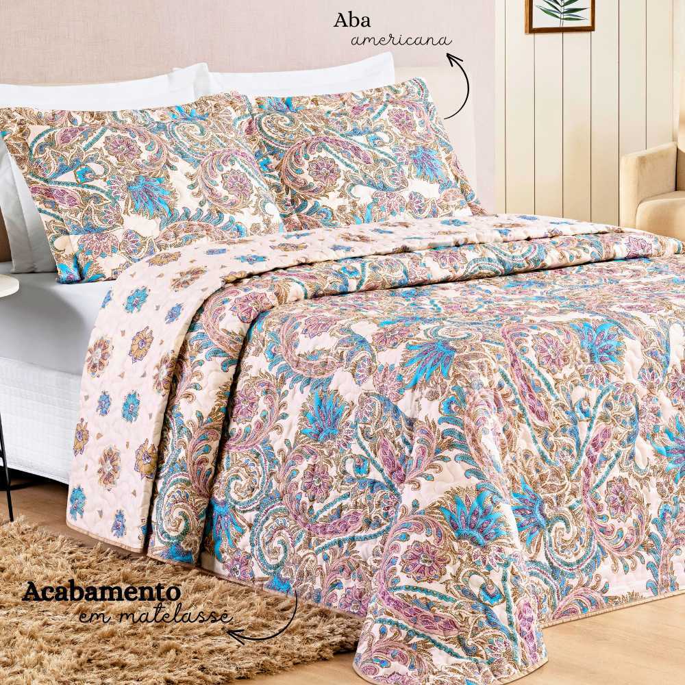 Cobre Leito Colcha 3 Peças Casal Padrão Estampada Dupla Face Bouti Matelado e Aba Americana