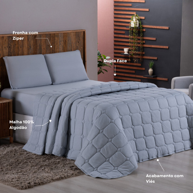 Cobre Leito Malha 100% Algodão Dupla Face – Conforto e Elegância para o Seu Quarto Transforme seu quarto em um refúgio de conforto e estilo com o Cobre Leito Solteiro Dupla Face de Malha 100% Algodão. Perfeito para quem busca uma combinação de suavidade, praticidade e um toque de elegância no ambiente. Características: Material Premium: Feito com malha 100% algodão, que oferece uma sensação de suavidade irresistível e conforto duradouro, ideal para noites de descanso tranquilas. Dupla Face: Mude o visual do seu quarto sempre que desejar! Com dois lados diferentes, você pode variar o estilo sem perder a praticidade e o charme. Tamanhos Diversos: Disponível em opções para camas de solteiro, casal, queen e king, garantindo o ajuste perfeito ao seu colchão. Benefícios: Conforto Imbatível: A malha de algodão proporciona um toque suave e aconchegante, criando um ambiente perfeito para relaxar após um dia agitado. Estilo Versátil: Se você ama mudanças no visual do seu quarto, o cobre leito dupla face é a escolha ideal para renovar o ambiente com facilidade, acompanhando seu estilo e as estações do ano. Durabilidade Garantida: Feito com materiais de alta qualidade, o cobre leito oferece resistência e longa vida útil, mantendo sua beleza por muito mais tempo. Especificações: Ao escolher Solteiro: 01 Colcha (160cm x 240cm) 01 Porta Travesseiro (50cm x 70cm) Ao escolher Casal: 01 Colcha (220cm x 240cm) 02 Porta Travesseiro (50cm x 70cm cada) Ao escolher Queen: 01 Colcha (240cm x 250cm) 02 Porta Travesseiro (50cm x 70cm cada) Ao escolher King: 01 Colcha (260cm x 280cm) 02 Porta Travesseiro (50cm x 70cm cada) Experimente o máximo em conforto e estilo no seu quarto com o Cobre Leito 100% Algodão Dupla Face. Garanta o seu agora e viva a sensação de um sono renovador!