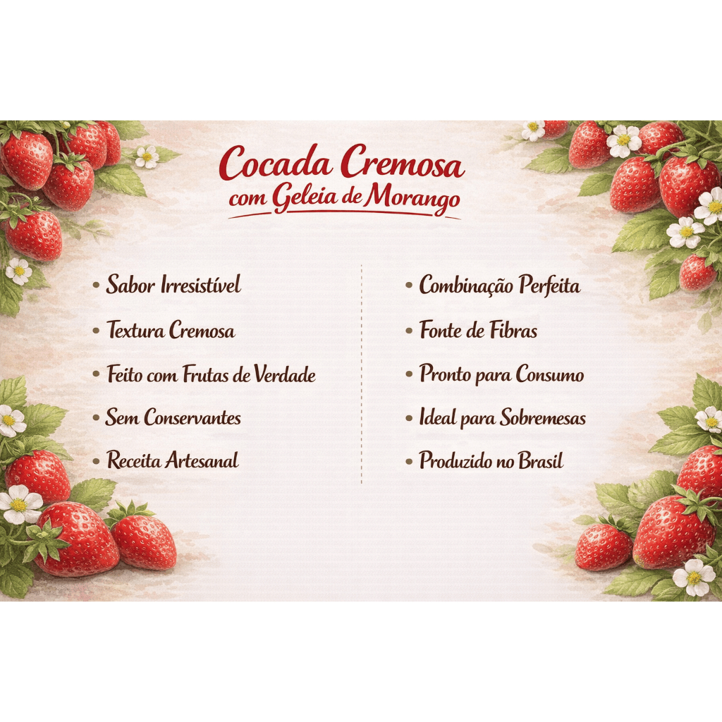 Cocada Cremosa com Geleia de Morango Recanto da Serra – 660g 🍓🥥 A deliciosa Cocada Cremosa com Geleia de Morango Recanto da Serra é um doce artesanal que une tradição e sabor em uma combinação irresistível. Produzida com ingredientes selecionados e de alta qualidade, ela traz a cremosidade da cocada tradicional com o toque especial e levemente ácido da geleia de morango, criando um equilíbrio perfeito de sabores. Ideal para quem aprecia doces caseiros com sabor marcante, essa cocada é perfeita para acompanhar cafés, servir como sobremesa ou até mesmo presentear alguém especial. Sua textura cremosa e seu sabor autêntico fazem dela uma excelente opção para qualquer momento do dia. Produzida no Brasil com todo cuidado e sem adição de conservantes artificiais, a Cocada Cremosa Recanto da Serra mantém o sabor típico dos doces artesanais que lembram as receitas tradicionais de família. 📦 Informações do Produto • Produto: Cocada Cremosa com Geleia de Morango • Marca: Recanto da Serra • Peso líquido: 660g • Sabor: Cocada cremosa com geleia de morango • Origem: Produto brasileiro • Textura: Cremosa e consistente • Glúten: Não contém glúten ⭐ Principais Características ✔ Produção artesanal ✔ Combinação deliciosa de coco com geleia de morango ✔ Ingredientes selecionados ✔ Textura cremosa e sabor intenso ✔ Ideal para sobremesas, cafés da tarde e lanches ✔ Perfeito para compartilhar com a família ✔ Produto tradicional brasileiro ✔ Sem conservantes artificiais 📅 Validade e Armazenamento • Validade: 12 meses (1 ano) a partir da data de fabricação. • Armazenamento: Conservar em local fresco, seco e ao abrigo da luz. • Após aberto: Manter refrigerado e consumir preferencialmente em até alguns dias para manter a qualidade e o sabor. 📊 Informações adicionais As informações nutricionais completas, lote e data de fabricação encontram-se no rótulo do produto. A Cocada Cremosa com Geleia de Morango Recanto da Serra é perfeita para quem busca um doce cremoso, saboroso e feito com qualidade. 🍓 Um sabor caseiro que conquista desde a primeira colherada!